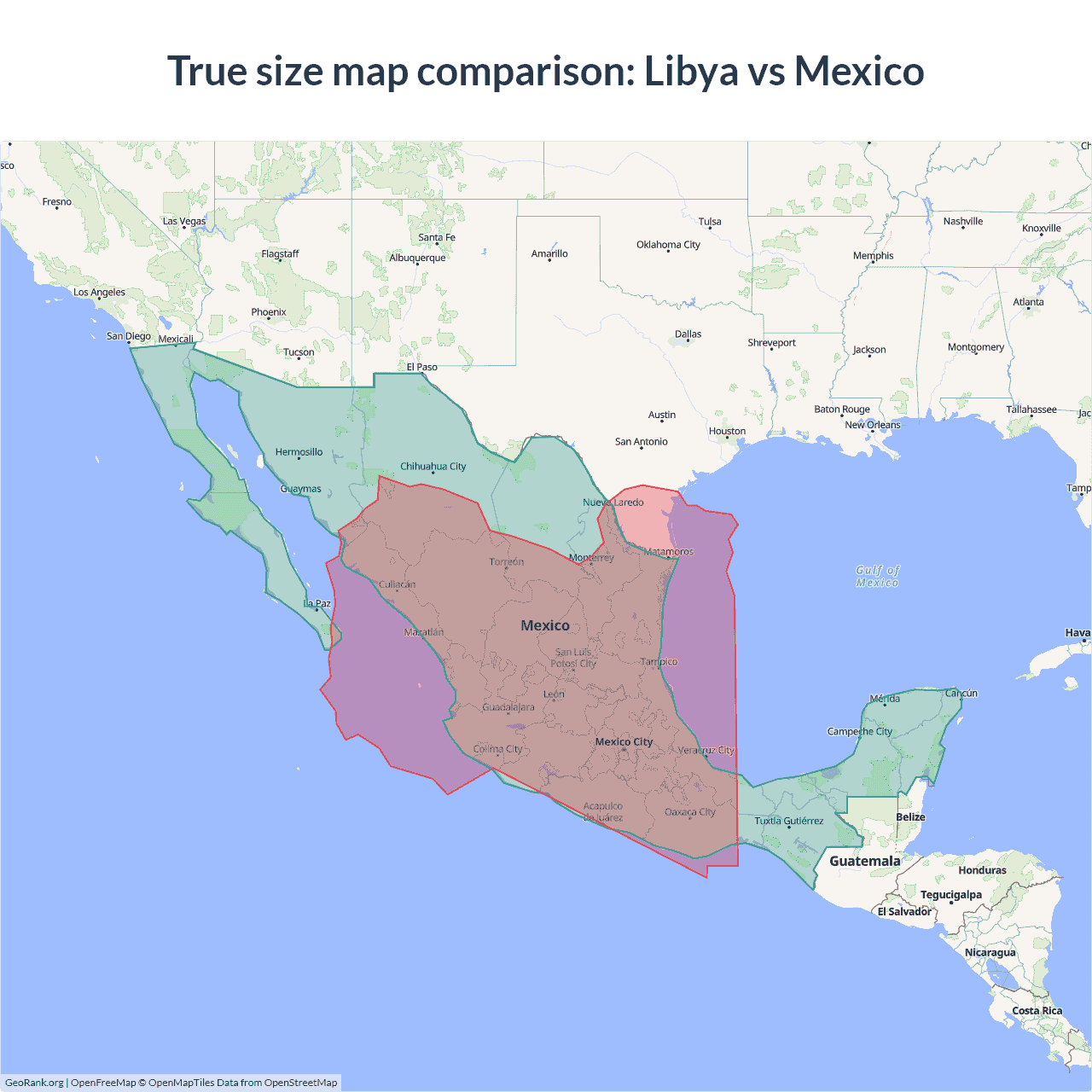 The map above outlines the borders of Libya and Mexico but is not accurate for size comparison because it's a 2d map with Mercator projection that distorts territories near the poles. The farther a country is from the equator, the more magnified it appears. More about country size projections.