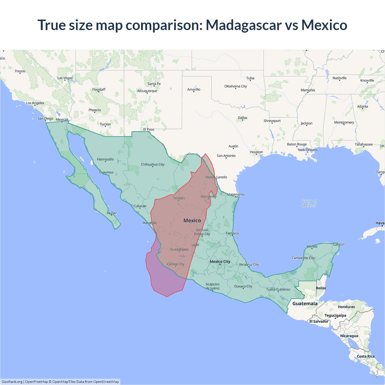 The map above outlines the borders of Madagascar and Mexico but is not accurate for size comparison because it's a 2d map with Mercator projection that distorts territories near the poles. The farther a country is from the equator, the more magnified it appears. More about country size projections.