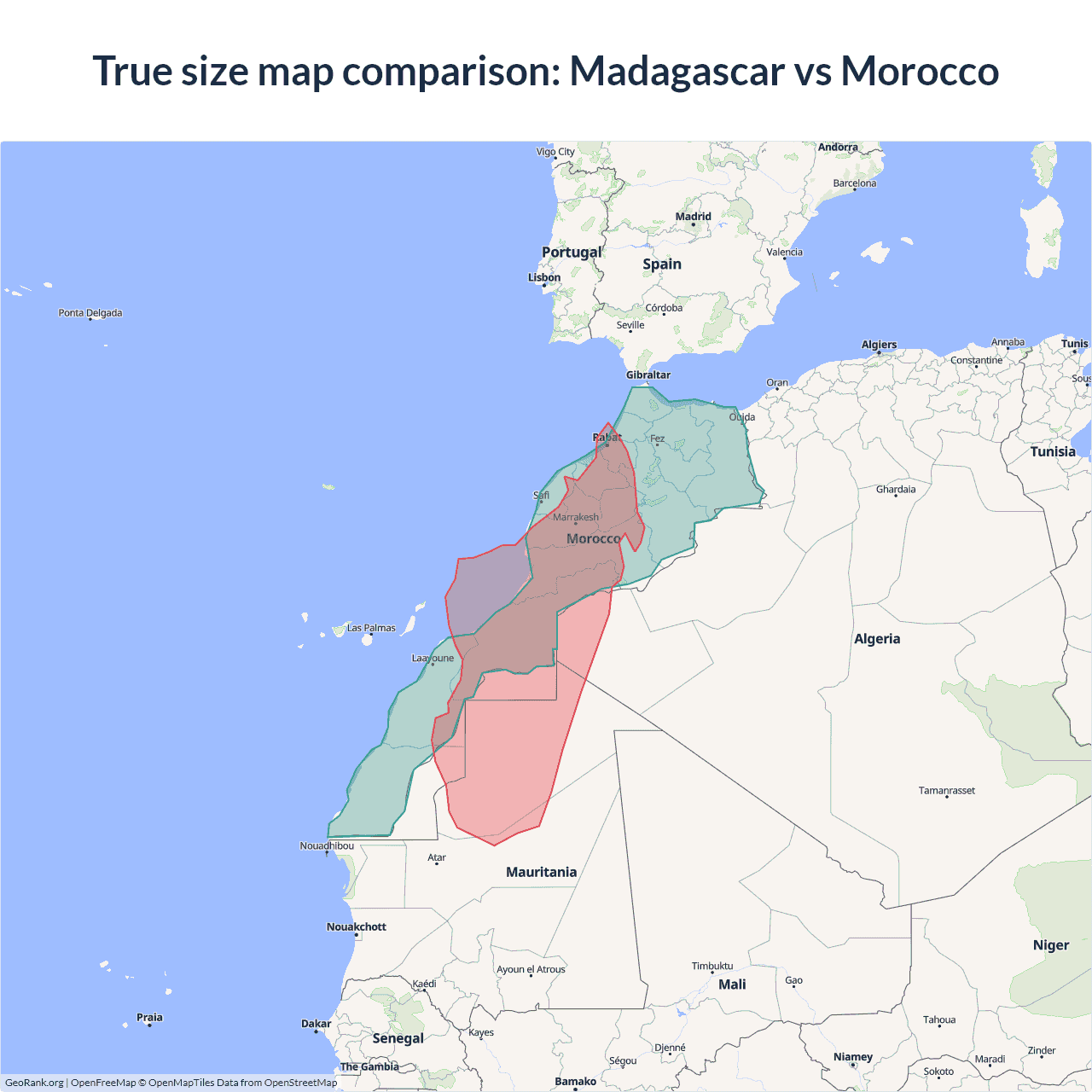 The map above outlines the borders of Madagascar and Morocco but is not accurate for size comparison because it's a 2d map with Mercator projection that distorts territories near the poles. The farther a country is from the equator, the more magnified it appears. More about country size projections.