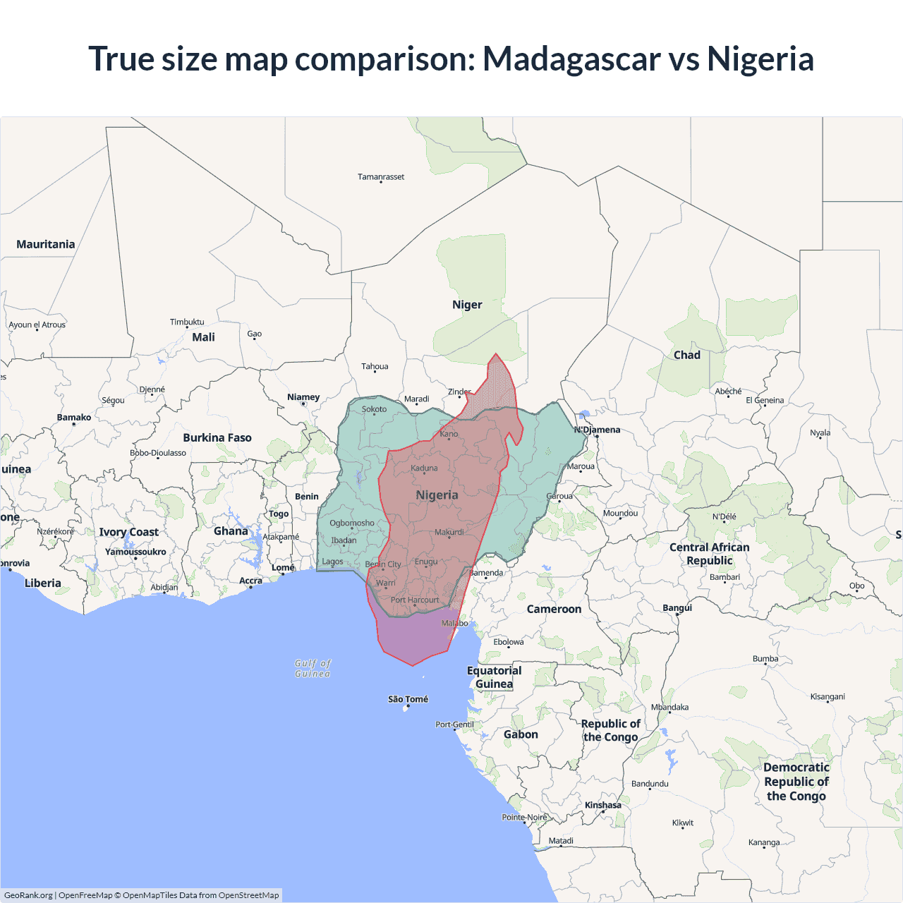 The map above outlines the borders of Madagascar and Nigeria but is not accurate for size comparison because it's a 2d map with Mercator projection that distorts territories near the poles. The farther a country is from the equator, the more magnified it appears. More about country size projections.