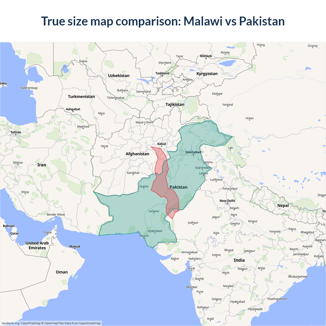 The map above outlines the borders of Malawi and Pakistan but is not accurate for size comparison because it's a 2d map with Mercator projection that distorts territories near the poles. The farther a country is from the equator, the more magnified it appears. More about country size projections.
