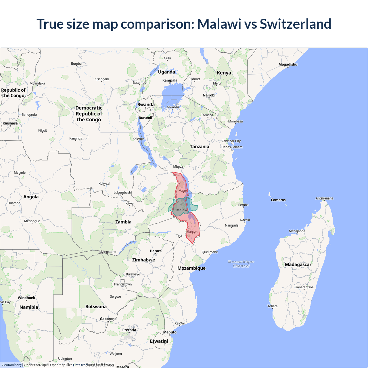 The map above outlines the borders of Malawi and Switzerland but is not accurate for size comparison because it's a 2d map with Mercator projection that distorts territories near the poles. The farther a country is from the equator, the more magnified it appears. More about country size projections.