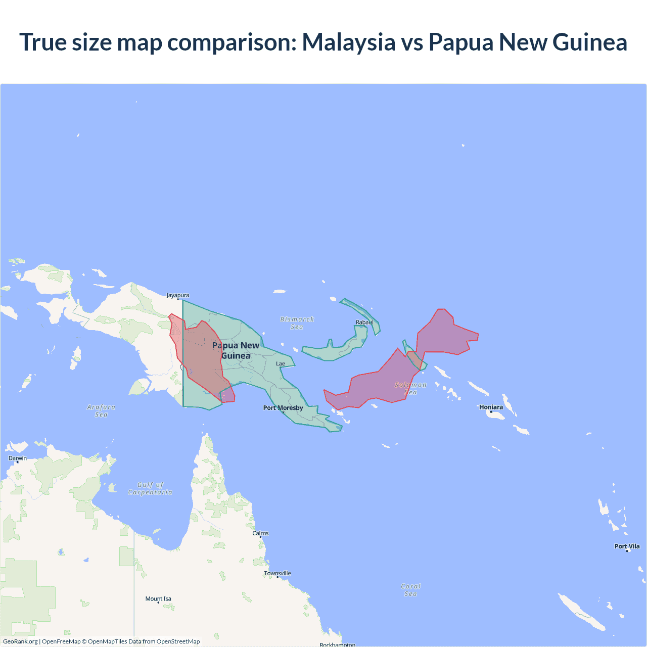 The map above outlines the borders of Malaysia and Papua New Guinea but is not accurate for size comparison because it's a 2d map with Mercator projection that distorts territories near the poles. The farther a country is from the equator, the more magnified it appears. More about country size projections.