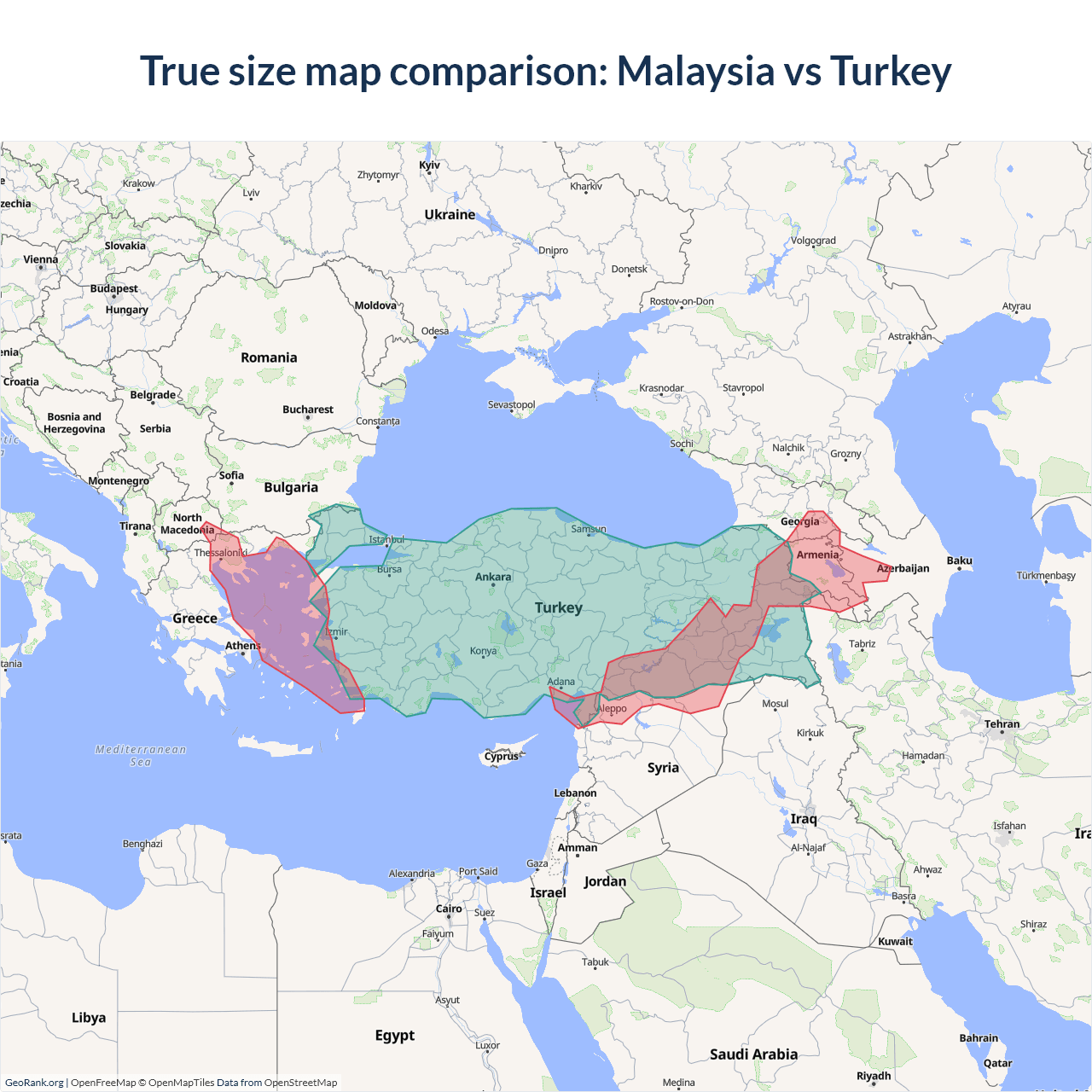 The map above outlines the borders of Malaysia and Turkey but is not accurate for size comparison because it's a 2d map with Mercator projection that distorts territories near the poles. The farther a country is from the equator, the more magnified it appears. More about country size projections.