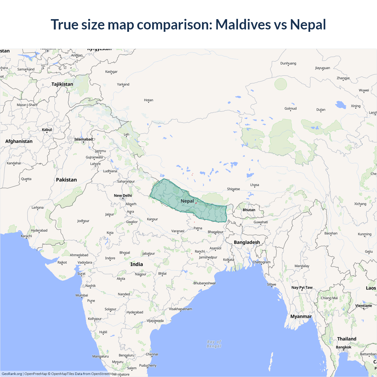 The map above outlines the borders of Maldives and Nepal but is not accurate for size comparison because it's a 2d map with Mercator projection that distorts territories near the poles. The farther a country is from the equator, the more magnified it appears. More about country size projections.