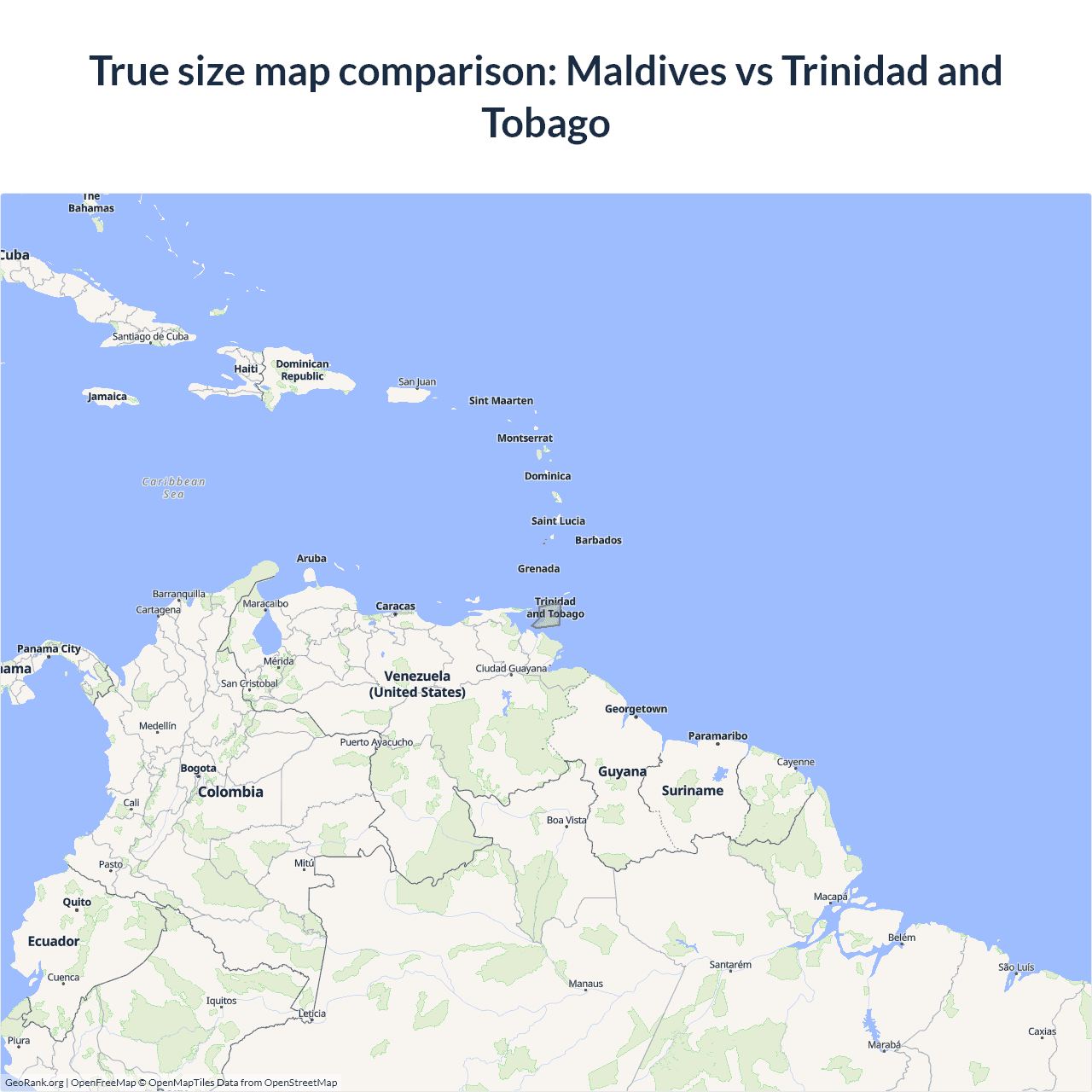 The map above outlines the borders of Maldives and Trinidad and Tobago but is not accurate for size comparison because it's a 2d map with Mercator projection that distorts territories near the poles. The farther a country is from the equator, the more magnified it appears. More about country size projections.