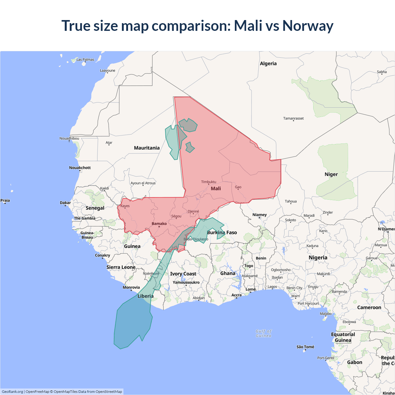 The map above outlines the borders of Mali and Norway but is not accurate for size comparison because it's a 2d map with Mercator projection that distorts territories near the poles. The farther a country is from the equator, the more magnified it appears. More about country size projections.