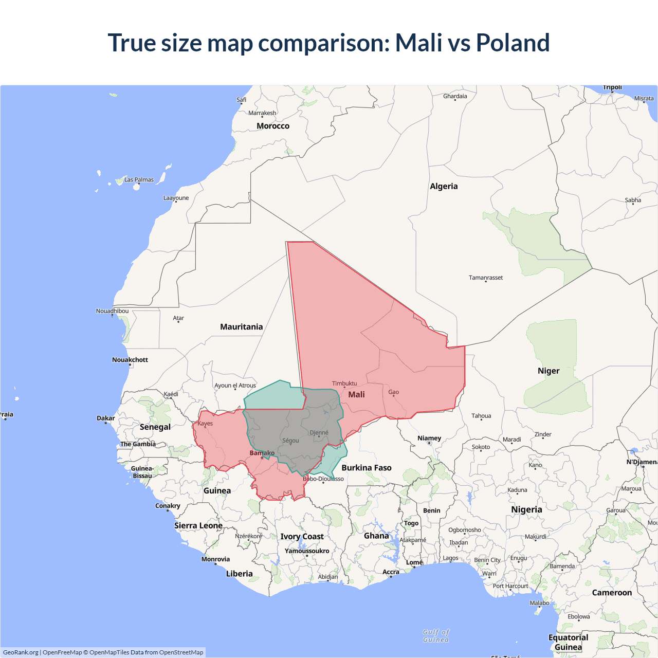 The map above outlines the borders of Mali and Poland but is not accurate for size comparison because it's a 2d map with Mercator projection that distorts territories near the poles. The farther a country is from the equator, the more magnified it appears. More about country size projections.