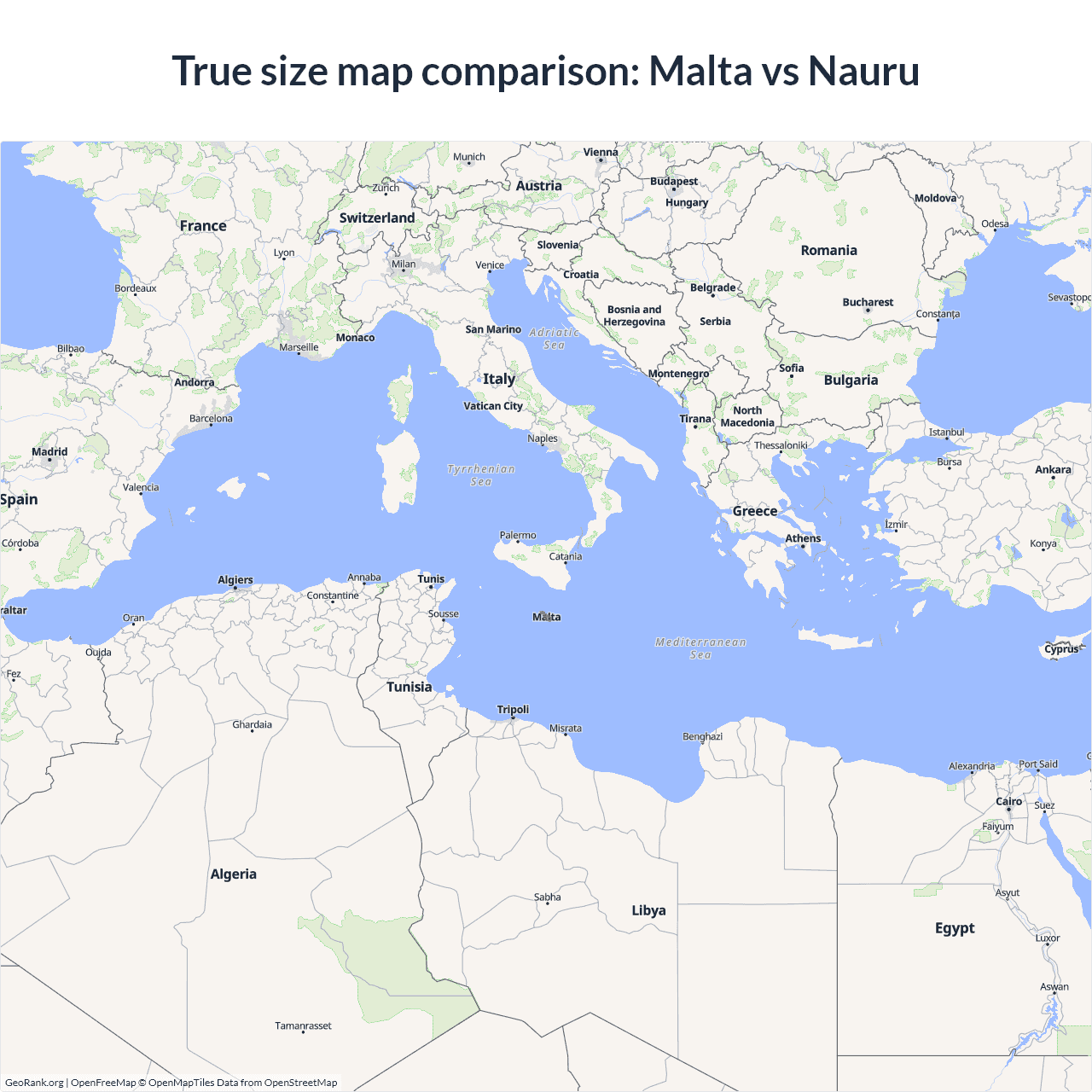 The map above outlines the borders of Malta and Nauru but is not accurate for size comparison because it's a 2d map with Mercator projection that distorts territories near the poles. The farther a country is from the equator, the more magnified it appears. More about country size projections.
