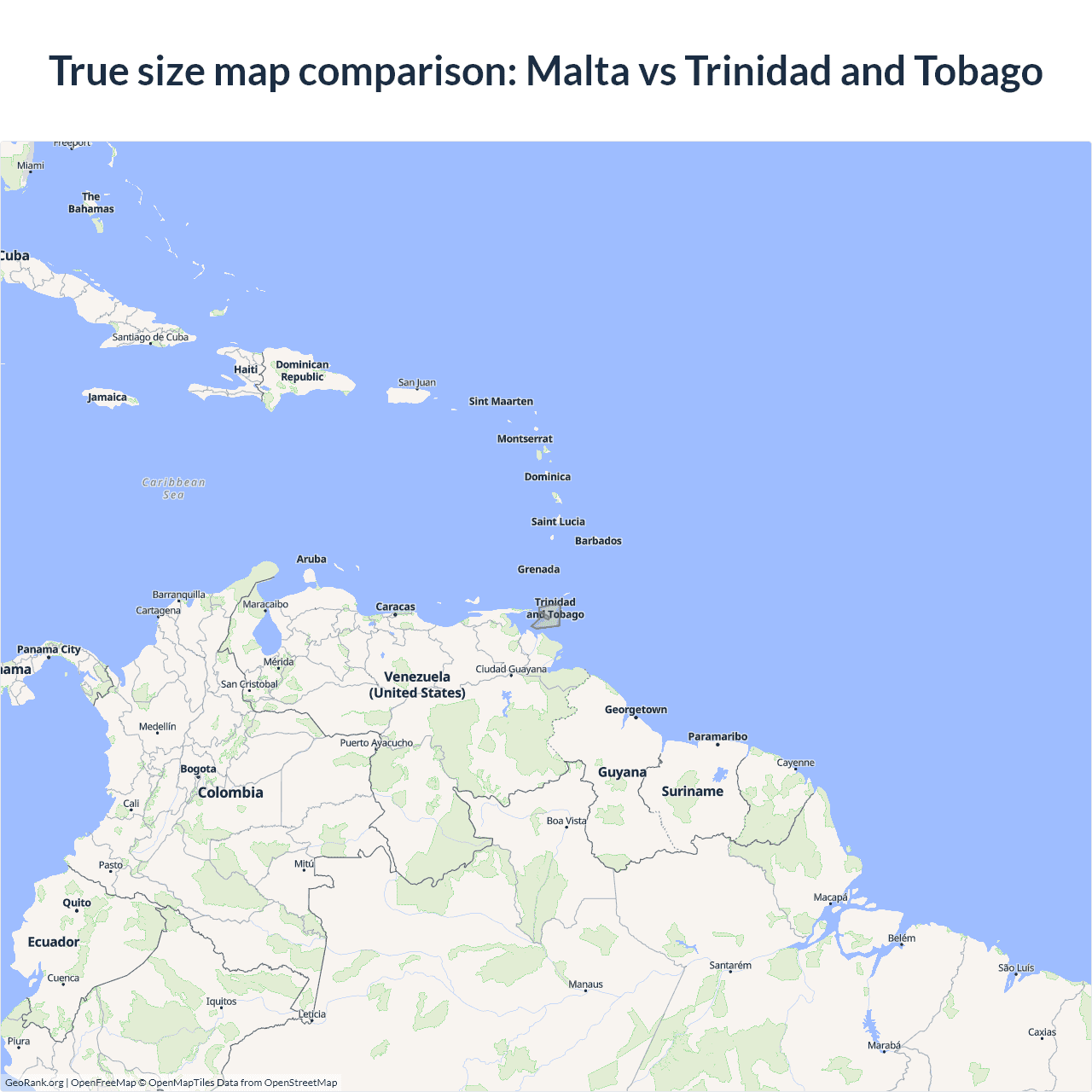 The map above outlines the borders of Malta and Trinidad and Tobago but is not accurate for size comparison because it's a 2d map with Mercator projection that distorts territories near the poles. The farther a country is from the equator, the more magnified it appears. More about country size projections.