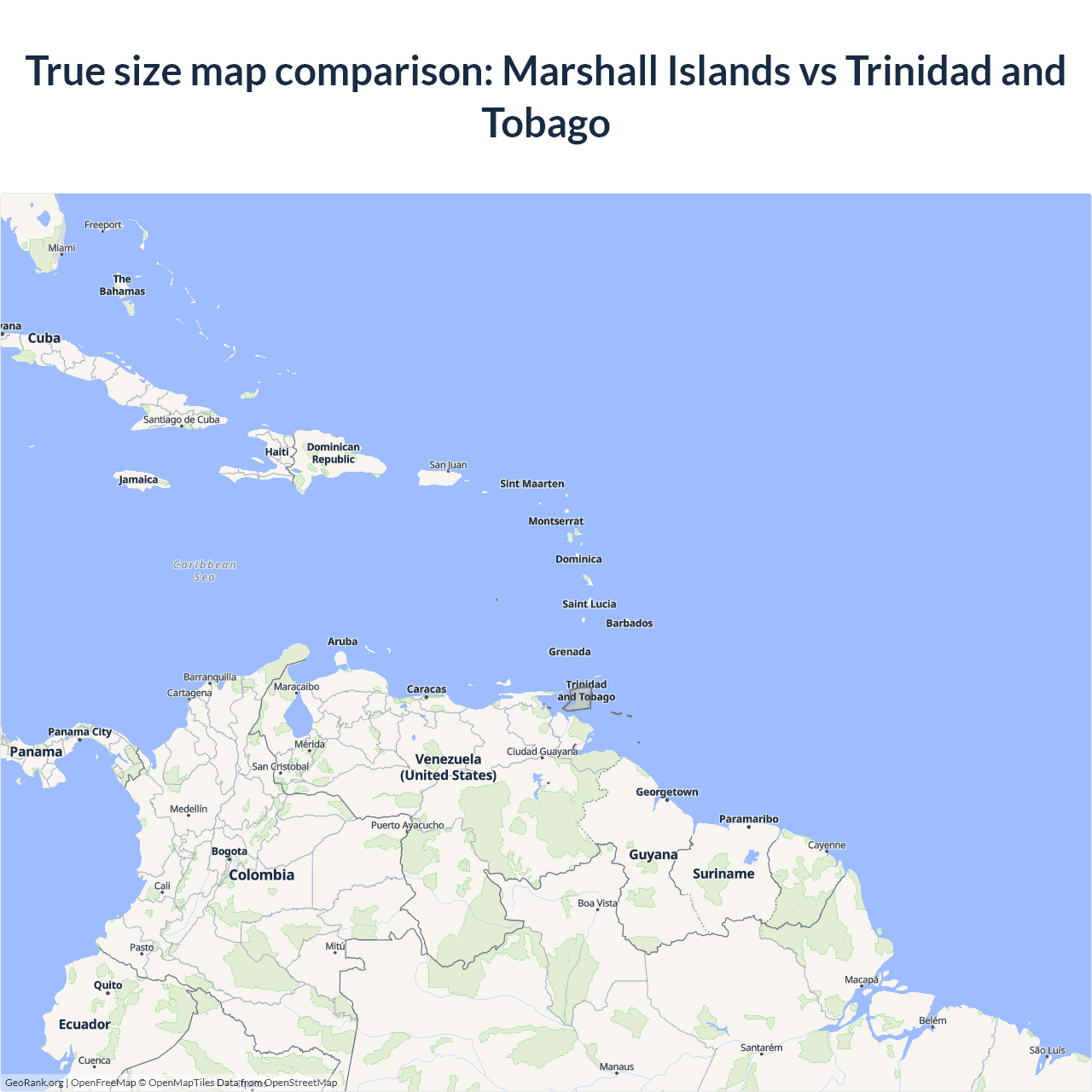 The map above outlines the borders of the Marshall Islands and Trinidad and Tobago but is not accurate for size comparison because it's a 2d map with Mercator projection that distorts territories near the poles. The farther a country is from the equator, the more magnified it appears. More about country size projections.