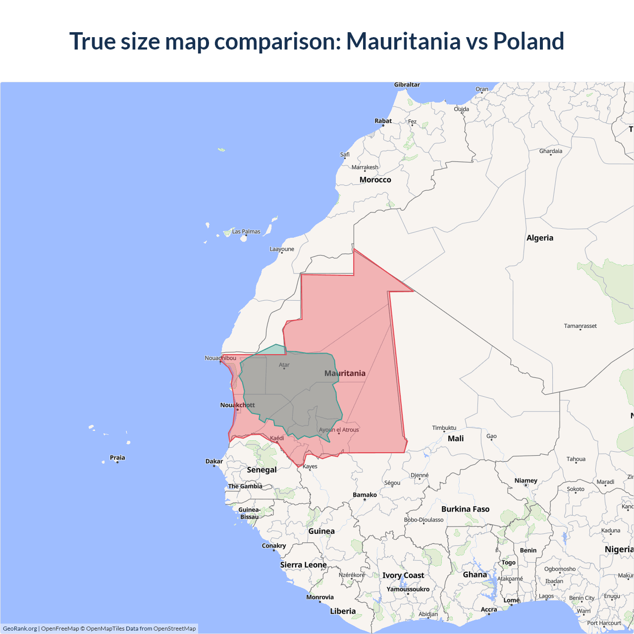 The map above outlines the borders of Mauritania and Poland but is not accurate for size comparison because it's a 2d map with Mercator projection that distorts territories near the poles. The farther a country is from the equator, the more magnified it appears. More about country size projections.