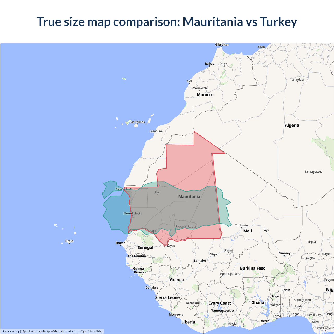 The map above outlines the borders of Mauritania and Turkey but is not accurate for size comparison because it's a 2d map with Mercator projection that distorts territories near the poles. The farther a country is from the equator, the more magnified it appears. More about country size projections.