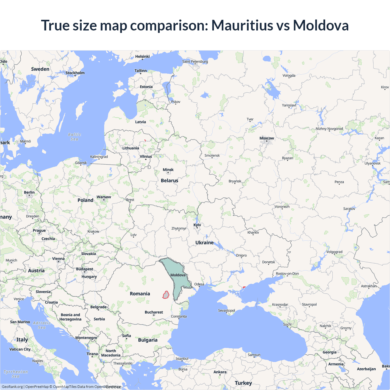 The map above outlines the borders of Mauritius and Moldova but is not accurate for size comparison because it's a 2d map with Mercator projection that distorts territories near the poles. The farther a country is from the equator, the more magnified it appears. More about country size projections.