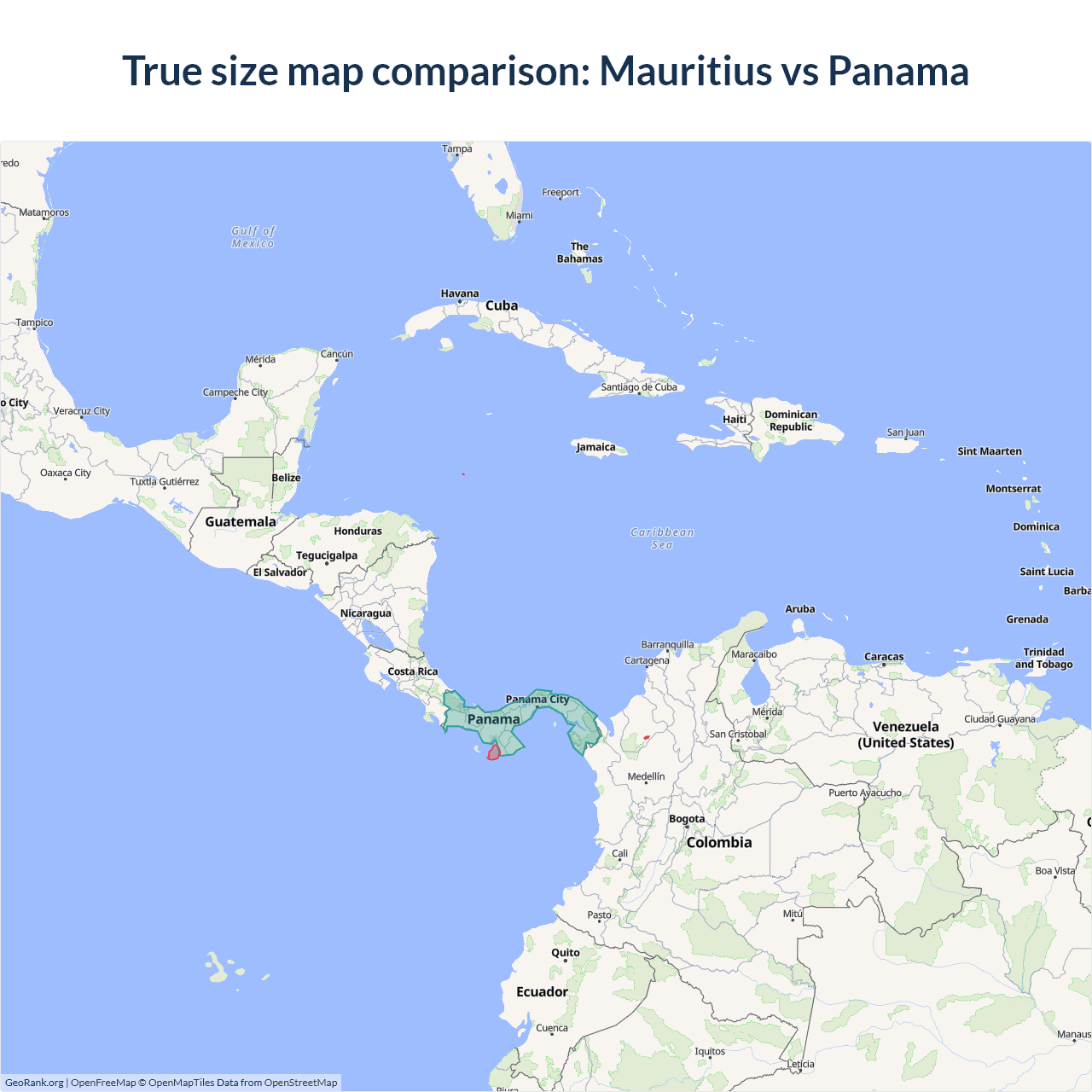 The map above outlines the borders of Mauritius and Panama but is not accurate for size comparison because it's a 2d map with Mercator projection that distorts territories near the poles. The farther a country is from the equator, the more magnified it appears. More about country size projections.