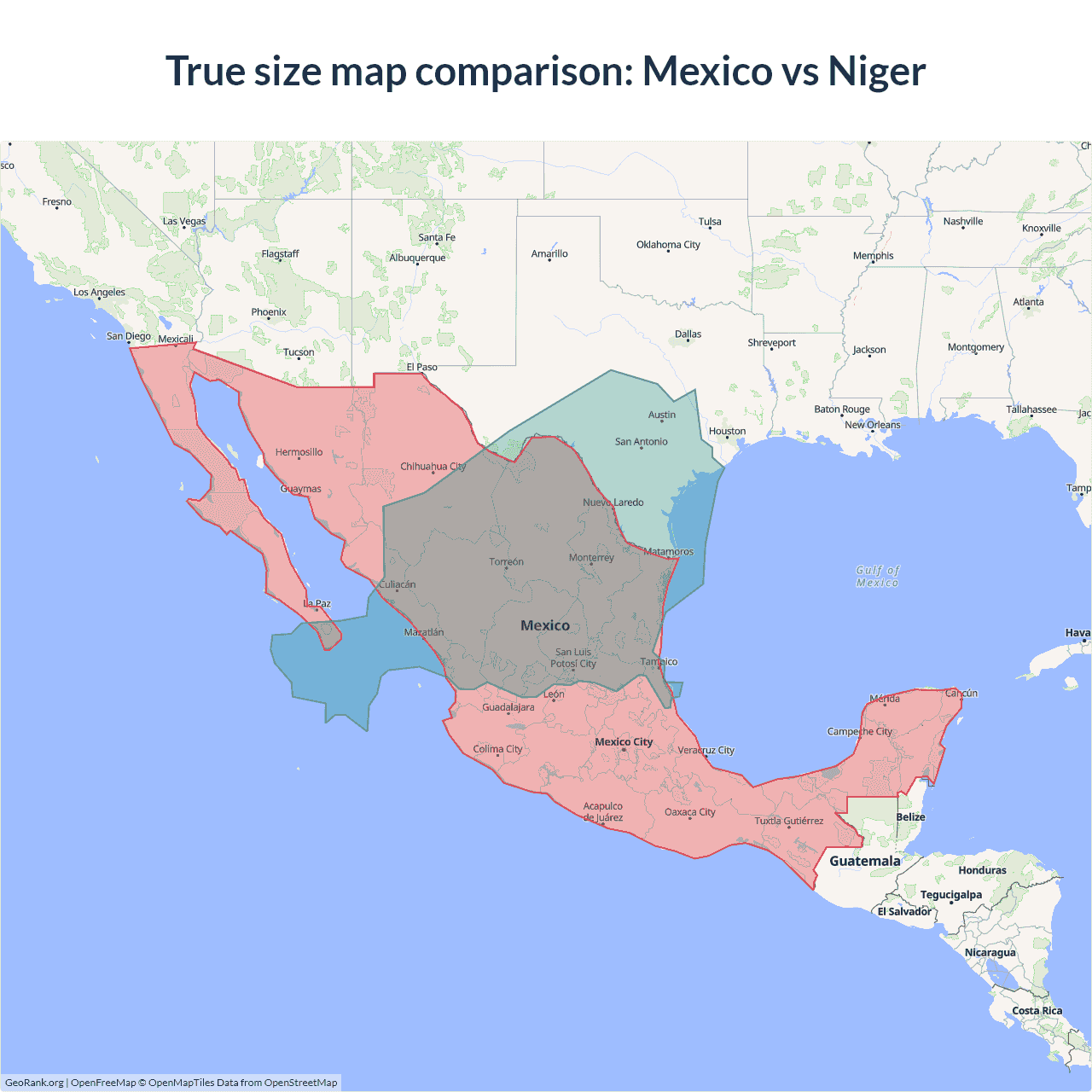 The map above outlines the borders of Mexico and Niger but is not accurate for size comparison because it's a 2d map with Mercator projection that distorts territories near the poles. The farther a country is from the equator, the more magnified it appears. More about country size projections.