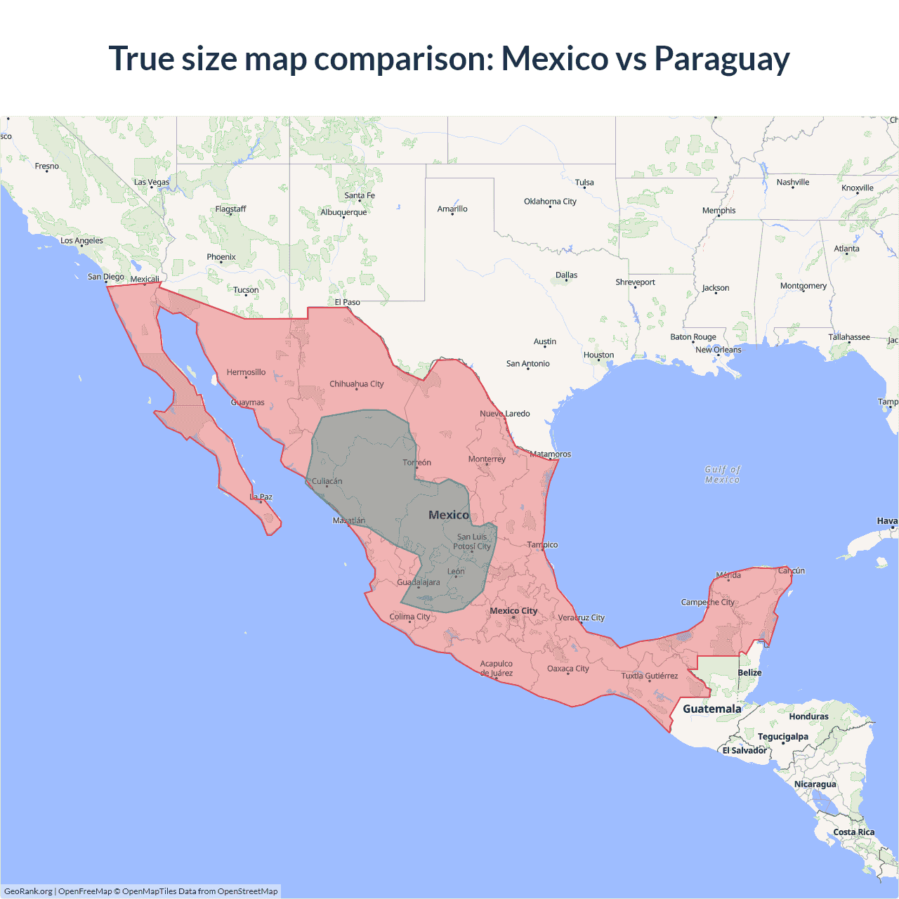 The map above outlines the borders of Mexico and Paraguay but is not accurate for size comparison because it's a 2d map with Mercator projection that distorts territories near the poles. The farther a country is from the equator, the more magnified it appears. More about country size projections.