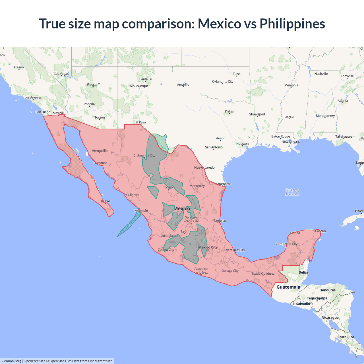 The map above outlines the borders of Mexico and the Philippines but is not accurate for size comparison because it's a 2d map with Mercator projection that distorts territories near the poles. The farther a country is from the equator, the more magnified it appears. More about country size projections.