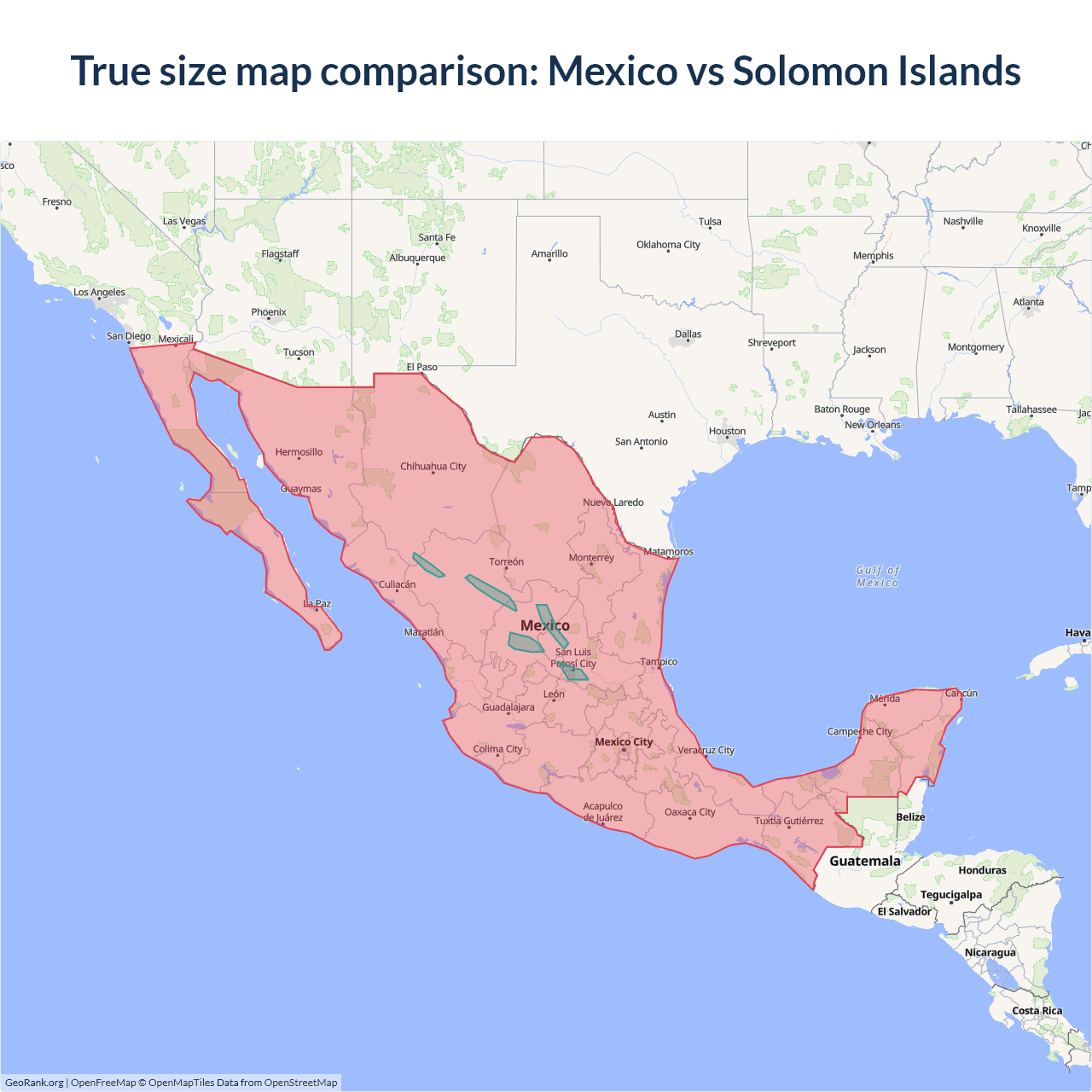 The map above outlines the borders of Mexico and the Solomon Islands but is not accurate for size comparison because it's a 2d map with Mercator projection that distorts territories near the poles. The farther a country is from the equator, the more magnified it appears. More about country size projections.
