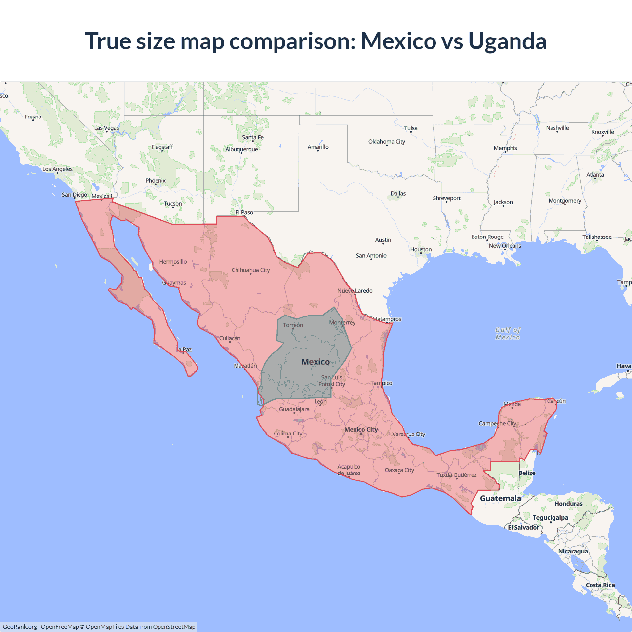 The map above outlines the borders of Mexico and Uganda but is not accurate for size comparison because it's a 2d map with Mercator projection that distorts territories near the poles. The farther a country is from the equator, the more magnified it appears. More about country size projections.