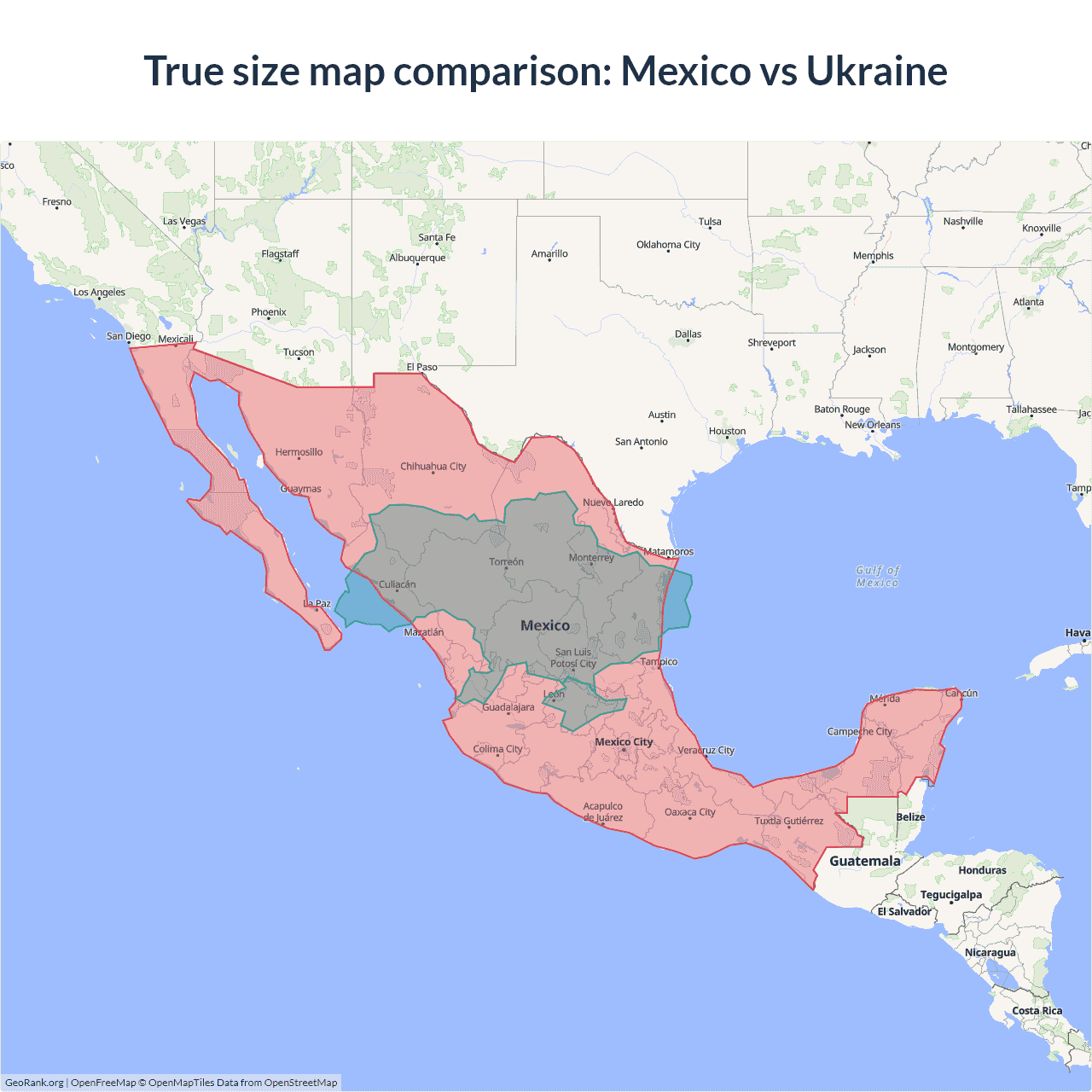 The map above outlines the borders of Mexico and Ukraine but is not accurate for size comparison because it's a 2d map with Mercator projection that distorts territories near the poles. The farther a country is from the equator, the more magnified it appears. More about country size projections.