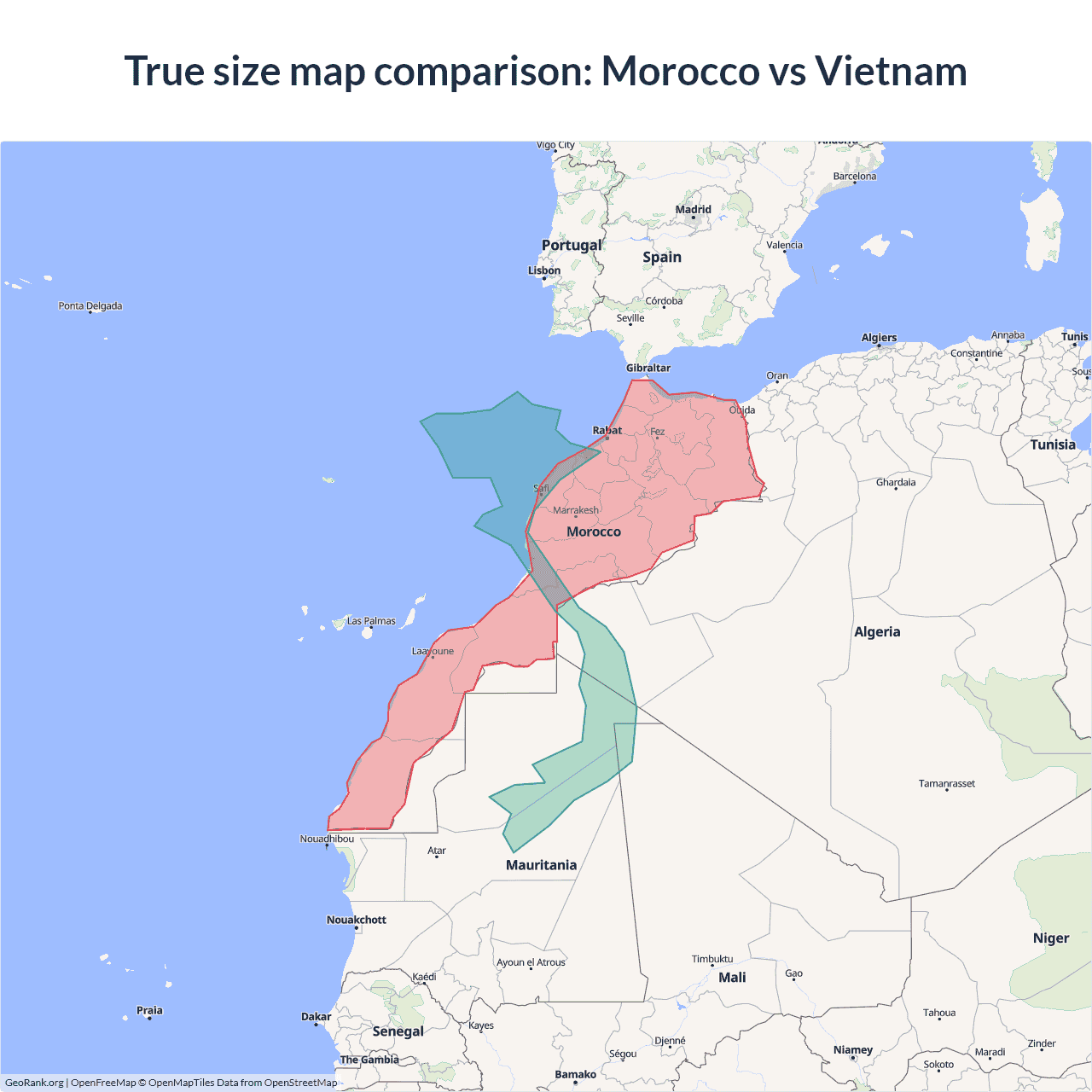 The map above outlines the borders of Morocco and Vietnam but is not accurate for size comparison because it's a 2d map with Mercator projection that distorts territories near the poles. The farther a country is from the equator, the more magnified it appears. More about country size projections.