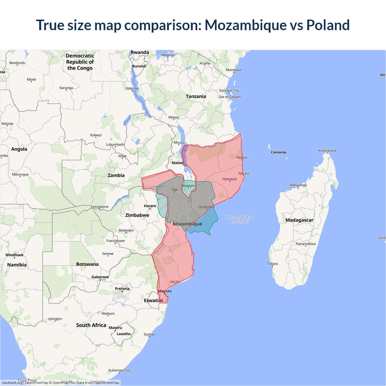 The map above outlines the borders of Mozambique and Poland but is not accurate for size comparison because it's a 2d map with Mercator projection that distorts territories near the poles. The farther a country is from the equator, the more magnified it appears. More about country size projections.