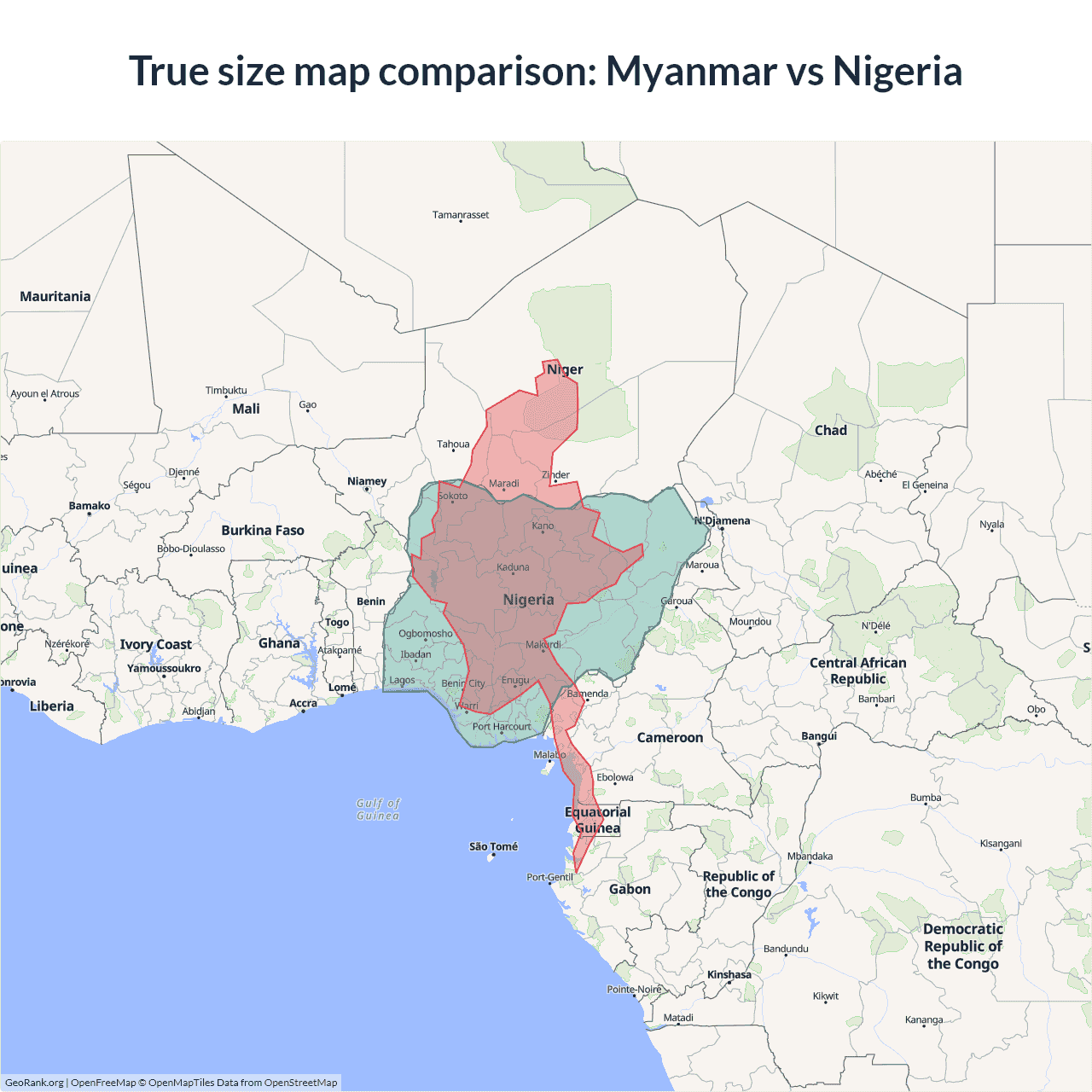 The map above outlines the borders of Myanmar and Nigeria but is not accurate for size comparison because it's a 2d map with Mercator projection that distorts territories near the poles. The farther a country is from the equator, the more magnified it appears. More about country size projections.