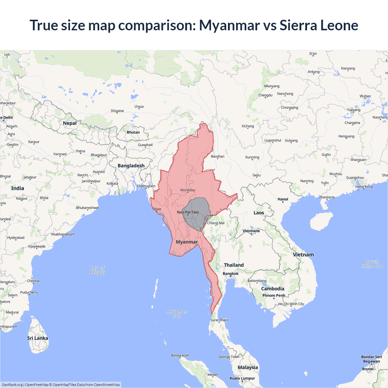 The map above outlines the borders of Myanmar and Sierra Leone but is not accurate for size comparison because it's a 2d map with Mercator projection that distorts territories near the poles. The farther a country is from the equator, the more magnified it appears. More about country size projections.