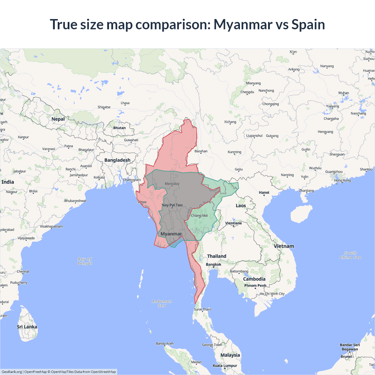 The map above outlines the borders of Myanmar and Spain but is not accurate for size comparison because it's a 2d map with Mercator projection that distorts territories near the poles. The farther a country is from the equator, the more magnified it appears. More about country size projections.