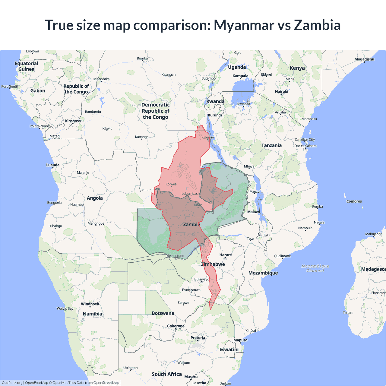 The map above outlines the borders of Myanmar and Zambia but is not accurate for size comparison because it's a 2d map with Mercator projection that distorts territories near the poles. The farther a country is from the equator, the more magnified it appears. More about country size projections.