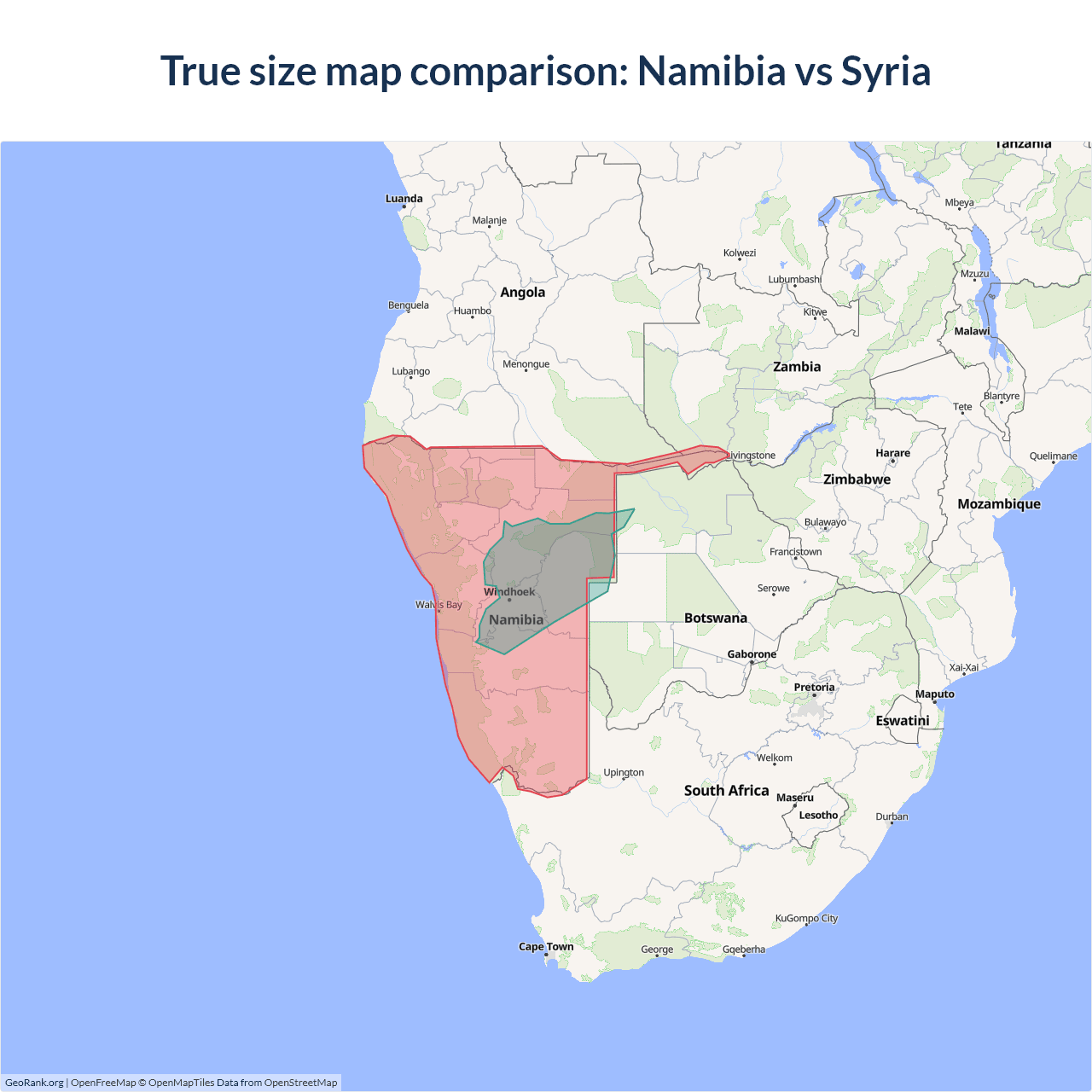 The map above outlines the borders of Namibia and Syria but is not accurate for size comparison because it's a 2d map with Mercator projection that distorts territories near the poles. The farther a country is from the equator, the more magnified it appears. More about country size projections.
