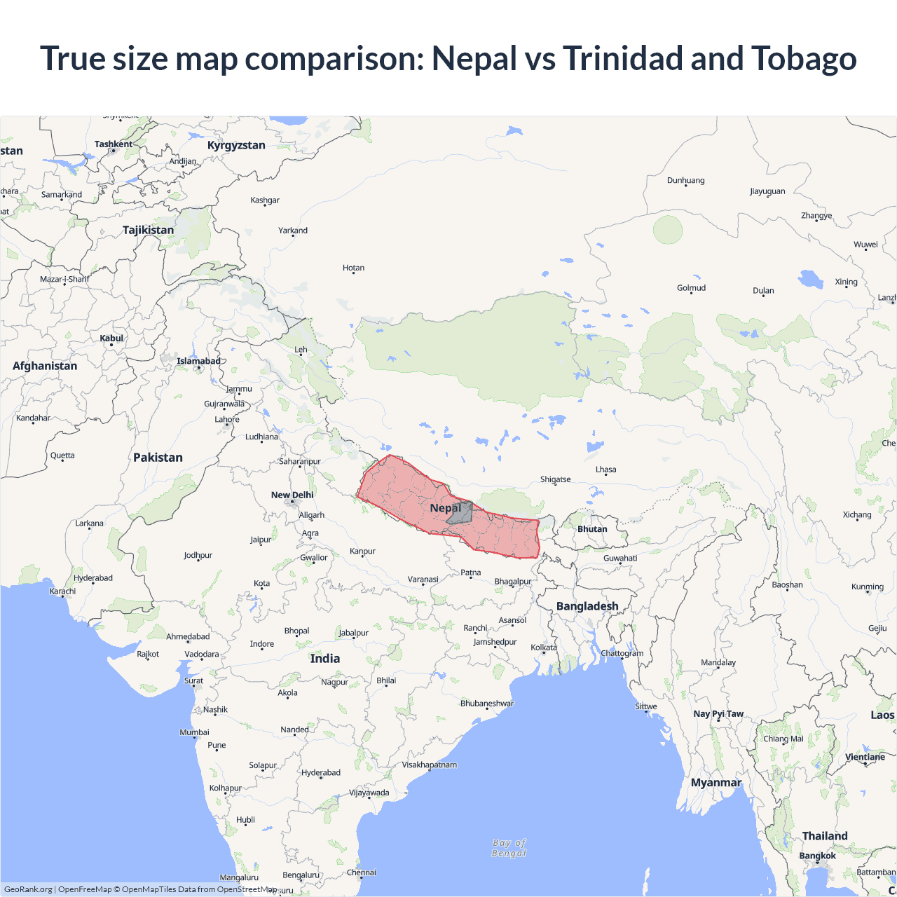 The map above outlines the borders of Nepal and Trinidad and Tobago but is not accurate for size comparison because it's a 2d map with Mercator projection that distorts territories near the poles. The farther a country is from the equator, the more magnified it appears. More about country size projections.