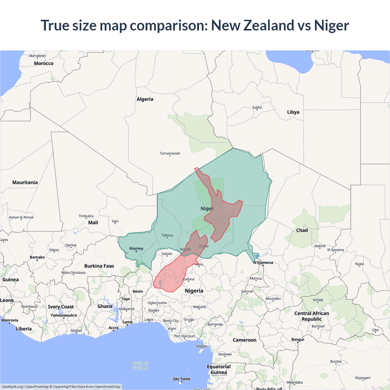 The map above outlines the borders of New Zealand and Niger but is not accurate for size comparison because it's a 2d map with Mercator projection that distorts territories near the poles. The farther a country is from the equator, the more magnified it appears. More about country size projections.