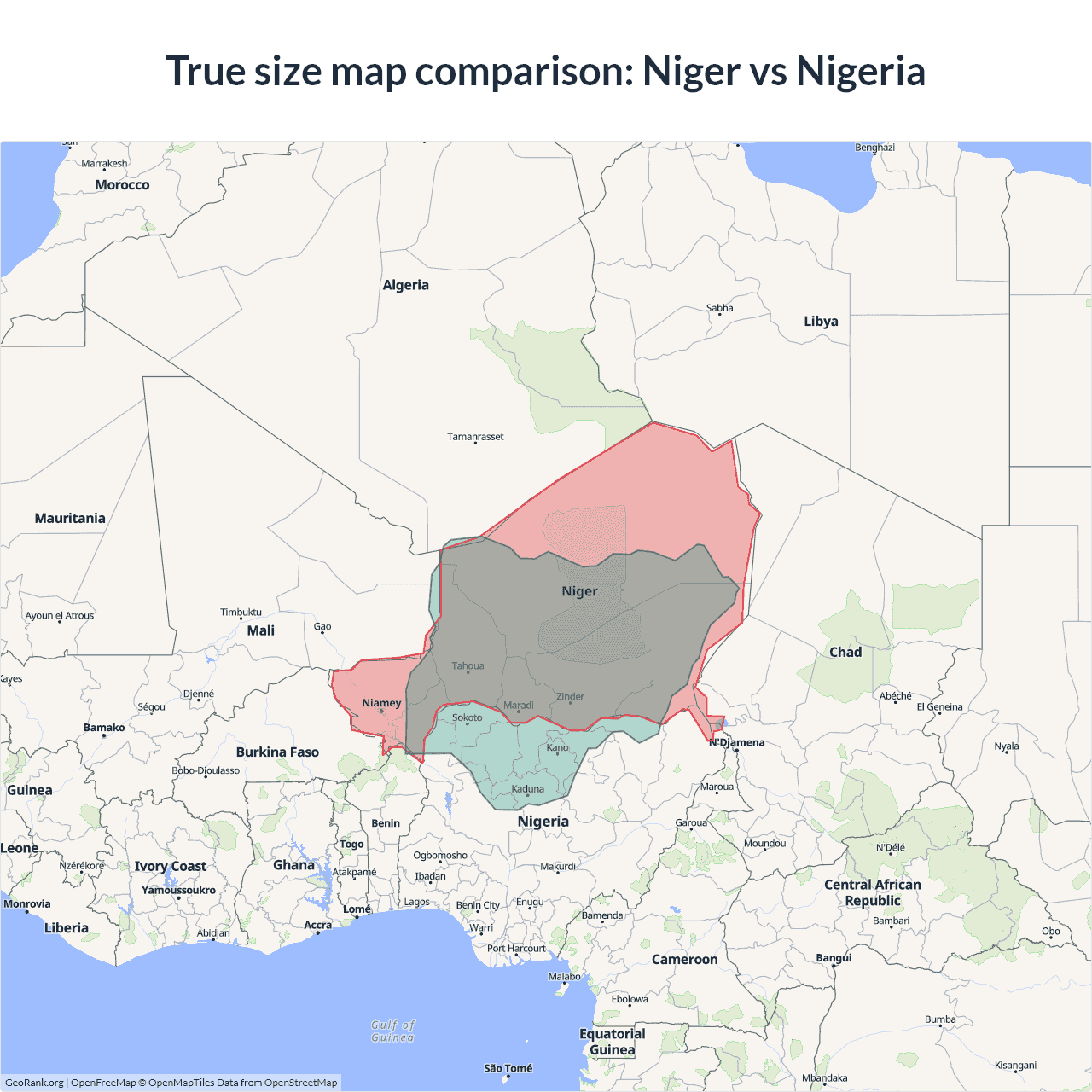 The map above outlines the borders of Niger and Nigeria but is not accurate for size comparison because it's a 2d map with Mercator projection that distorts territories near the poles. The farther a country is from the equator, the more magnified it appears. More about country size projections.