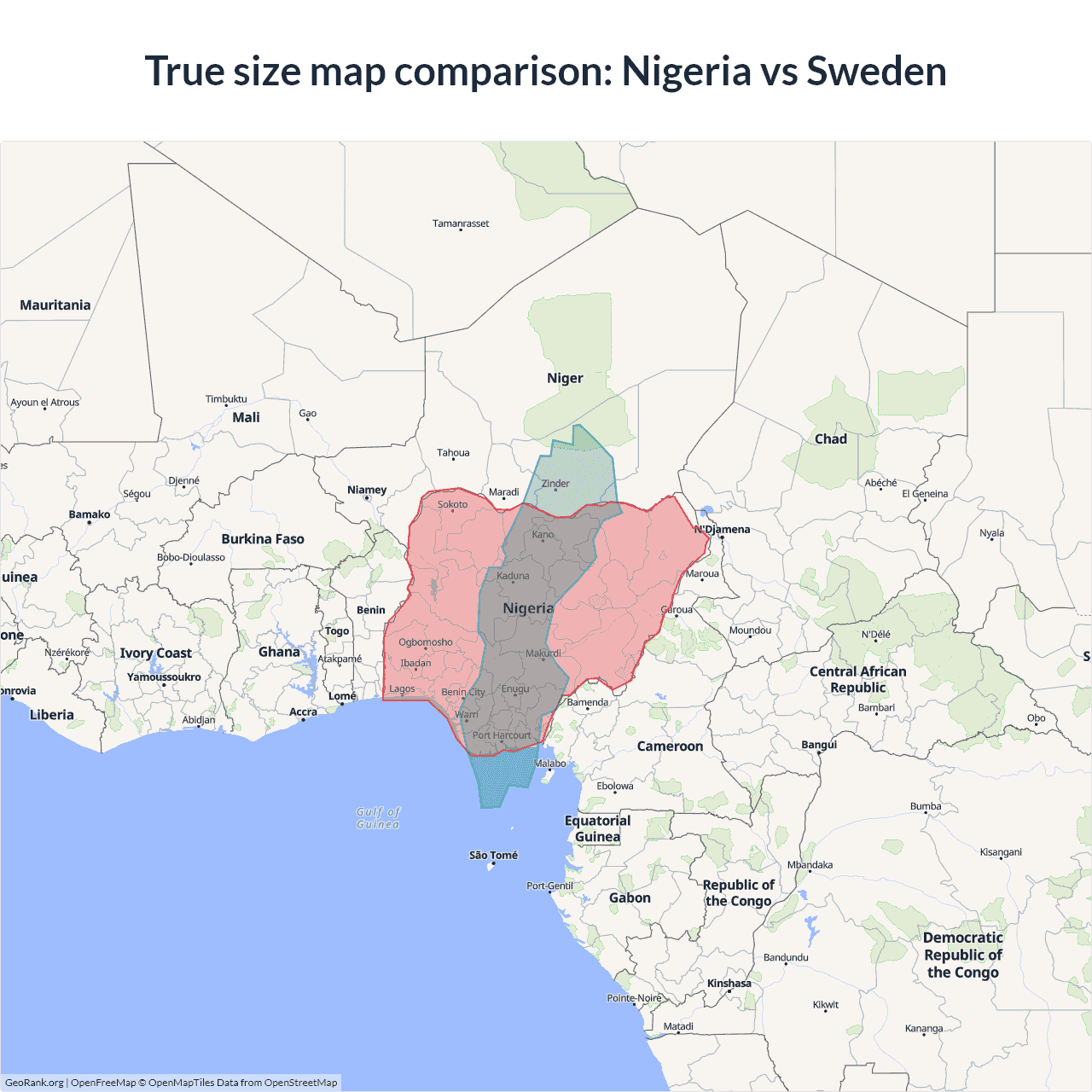 The map above outlines the borders of Nigeria and Sweden but is not accurate for size comparison because it's a 2d map with Mercator projection that distorts territories near the poles. The farther a country is from the equator, the more magnified it appears. More about country size projections.