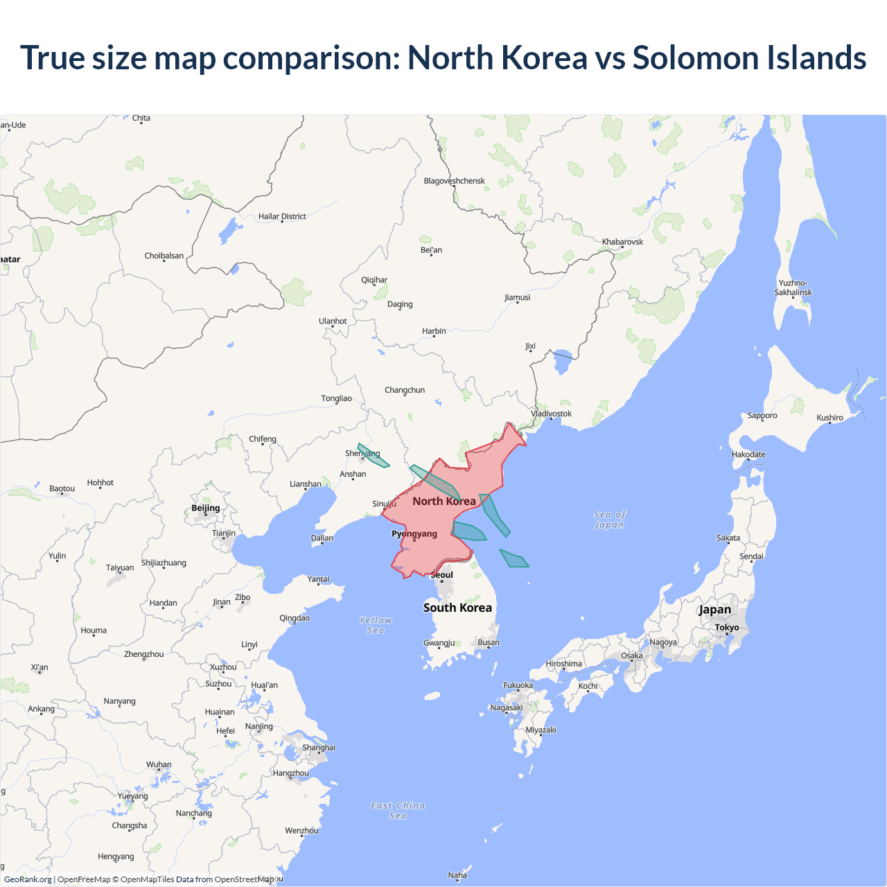 The map above outlines the borders of North Korea and the Solomon Islands but is not accurate for size comparison because it's a 2d map with Mercator projection that distorts territories near the poles. The farther a country is from the equator, the more magnified it appears. More about country size projections.