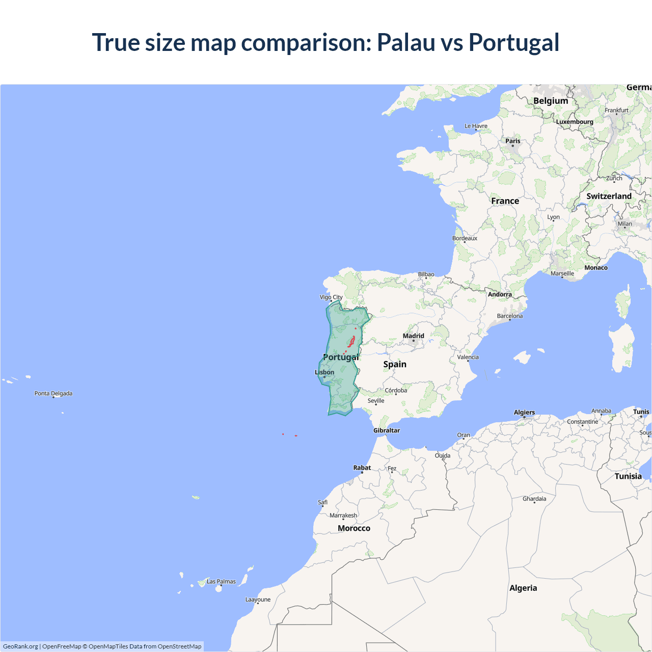 The map above outlines the borders of Palau and Portugal but is not accurate for size comparison because it's a 2d map with Mercator projection that distorts territories near the poles. The farther a country is from the equator, the more magnified it appears. More about country size projections.