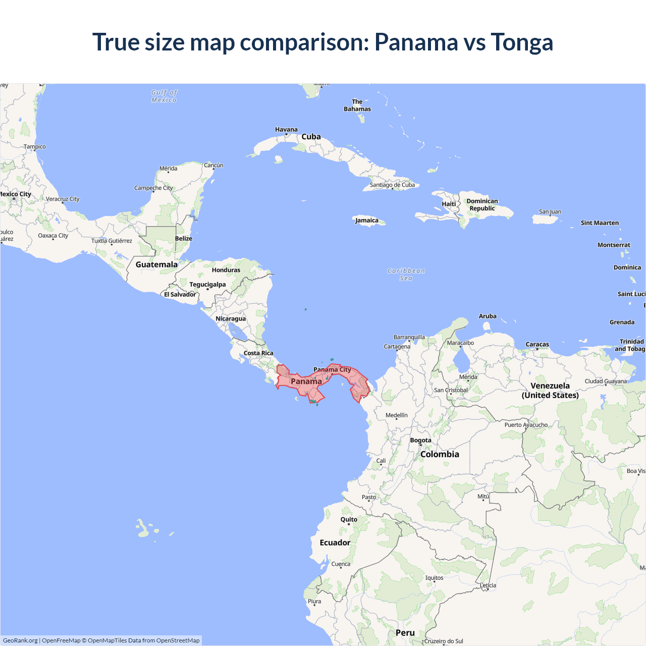 The map above outlines the borders of Panama and Tonga but is not accurate for size comparison because it's a 2d map with Mercator projection that distorts territories near the poles. The farther a country is from the equator, the more magnified it appears. More about country size projections.