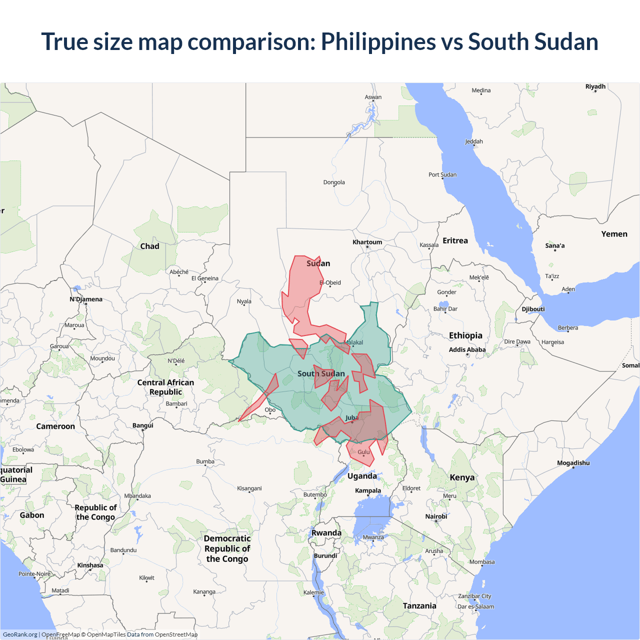 The map above outlines the borders of the Philippines and South Sudan but is not accurate for size comparison because it's a 2d map with Mercator projection that distorts territories near the poles. The farther a country is from the equator, the more magnified it appears. More about country size projections.
