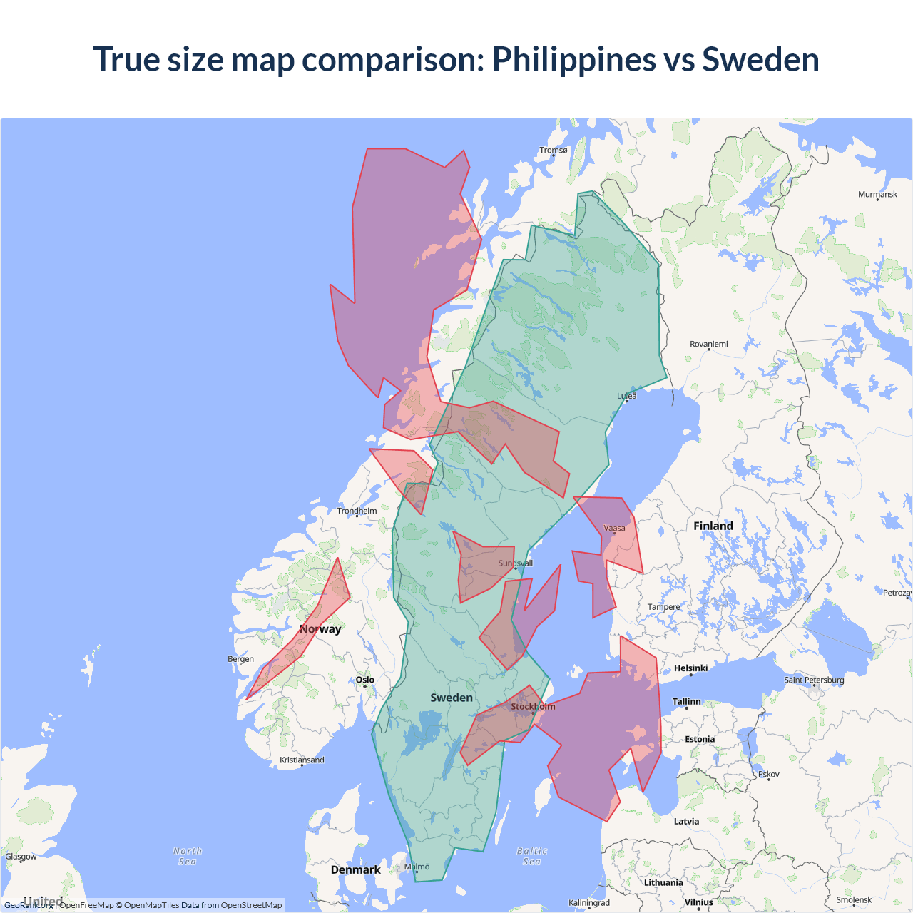 The map above outlines the borders of the Philippines and Sweden but is not accurate for size comparison because it's a 2d map with Mercator projection that distorts territories near the poles. The farther a country is from the equator, the more magnified it appears. More about country size projections.