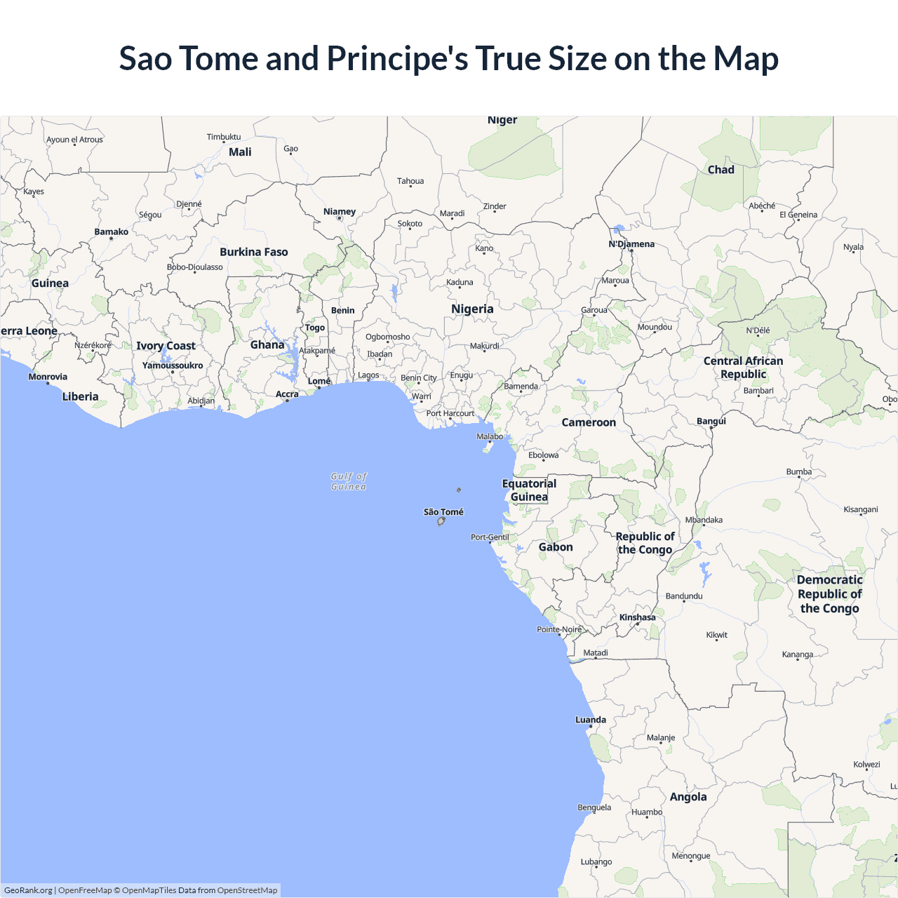 The map above outlines the borders of Sao Tome and Principe but is not accurate for size comparison because it's a 2d map with Mercator projection that distorts territories near the poles. The farther a country is from the equator, the more magnified it appears. More about country size projections.