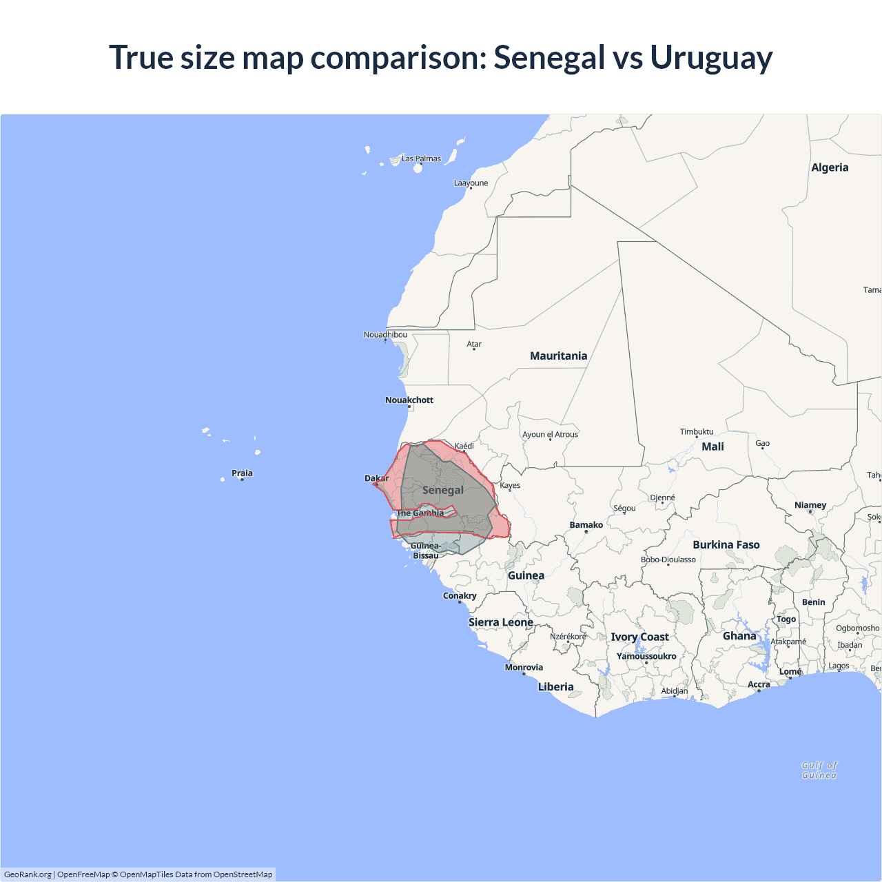 The map above outlines the borders of Senegal and Uruguay but is not accurate for size comparison because it's a 2d map with Mercator projection that distorts territories near the poles. The farther a country is from the equator, the more magnified it appears. More about country size projections.