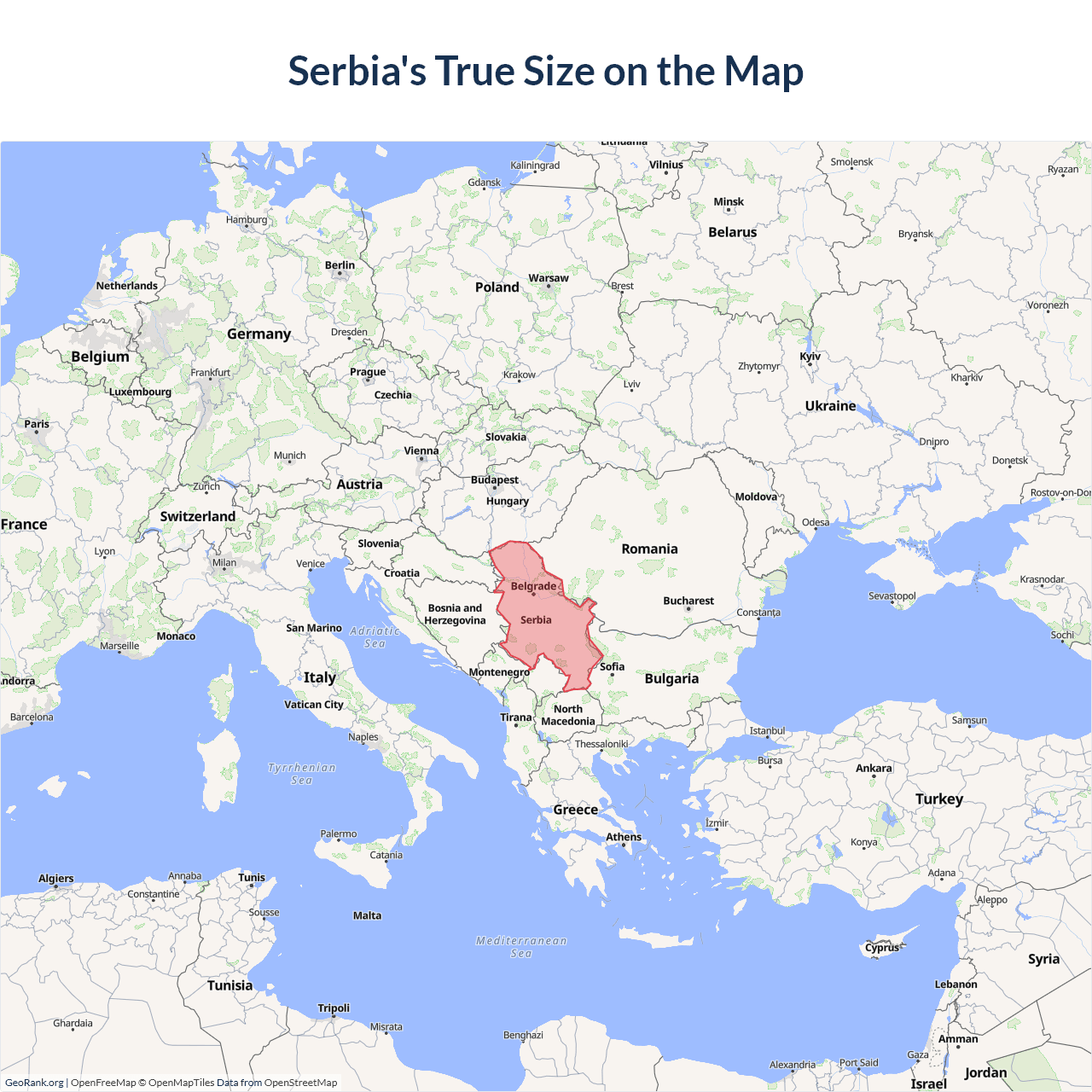 The map above outlines the borders of Serbia but is not accurate for size comparison because it's a 2d map with Mercator projection that distorts territories near the poles. The farther a country is from the equator, the more magnified it appears. More about country size projections.