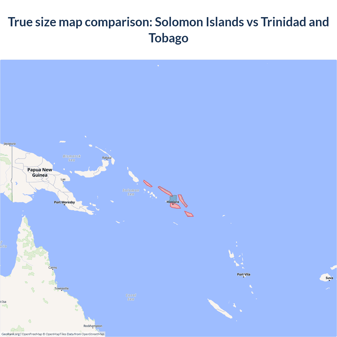 The map above outlines the borders of the Solomon Islands and Trinidad and Tobago but is not accurate for size comparison because it's a 2d map with Mercator projection that distorts territories near the poles. The farther a country is from the equator, the more magnified it appears. More about country size projections.