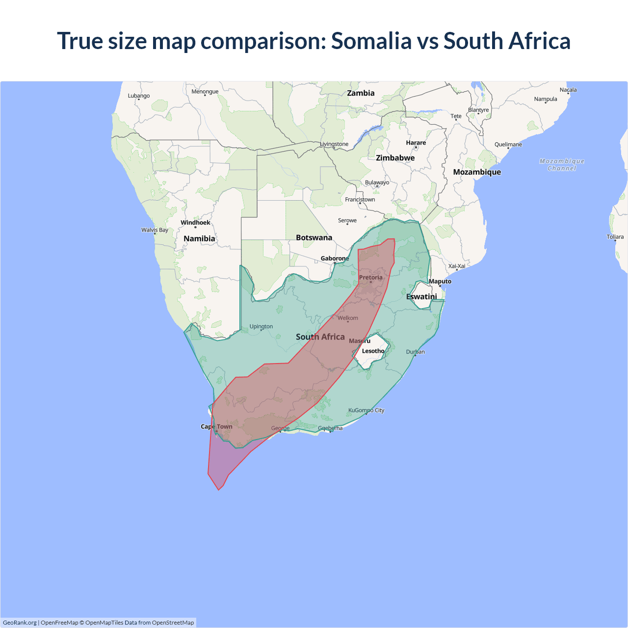 The map above outlines the borders of Somalia and South Africa but is not accurate for size comparison because it's a 2d map with Mercator projection that distorts territories near the poles. The farther a country is from the equator, the more magnified it appears. More about country size projections.