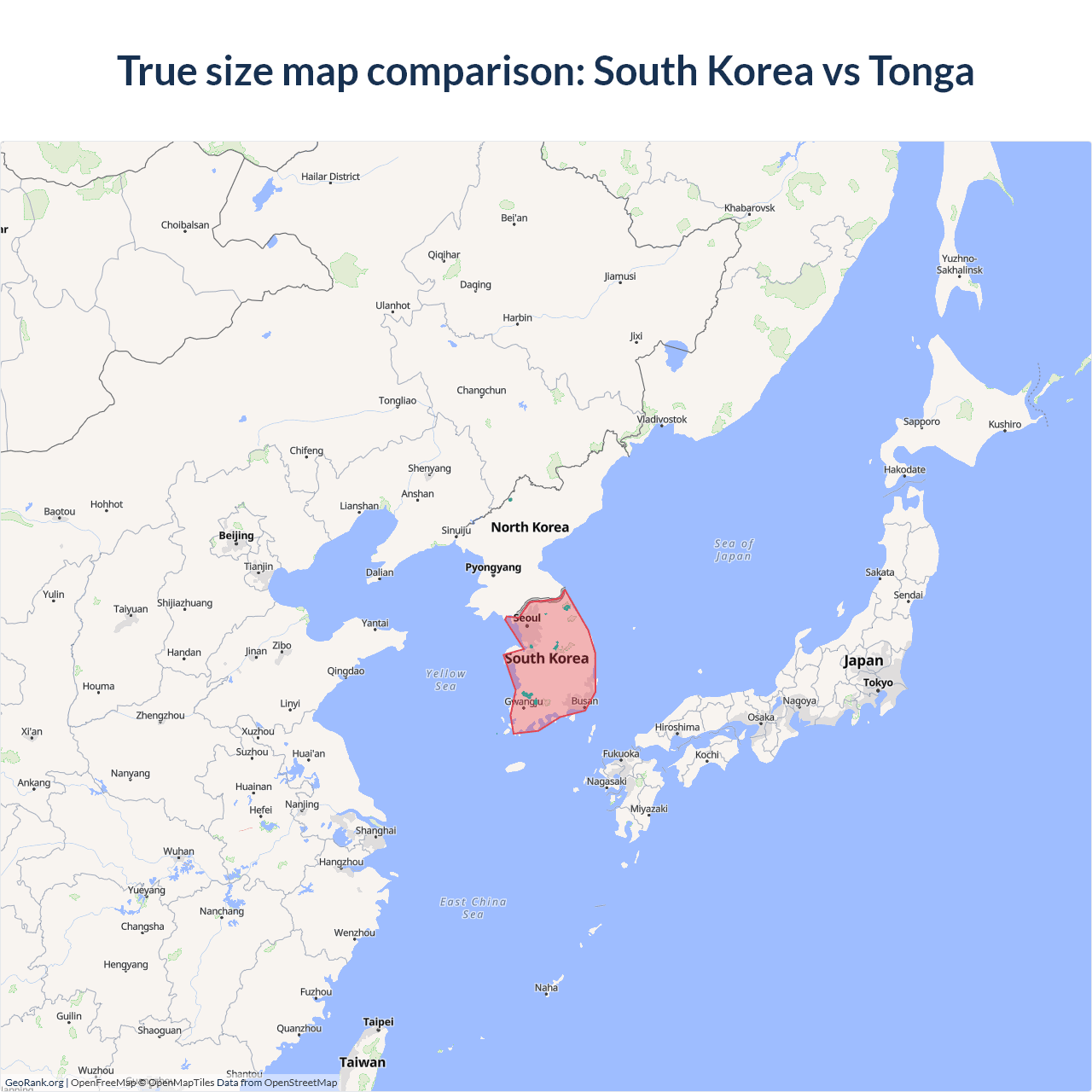 The map above outlines the borders of South Korea and Tonga but is not accurate for size comparison because it's a 2d map with Mercator projection that distorts territories near the poles. The farther a country is from the equator, the more magnified it appears. More about country size projections.
