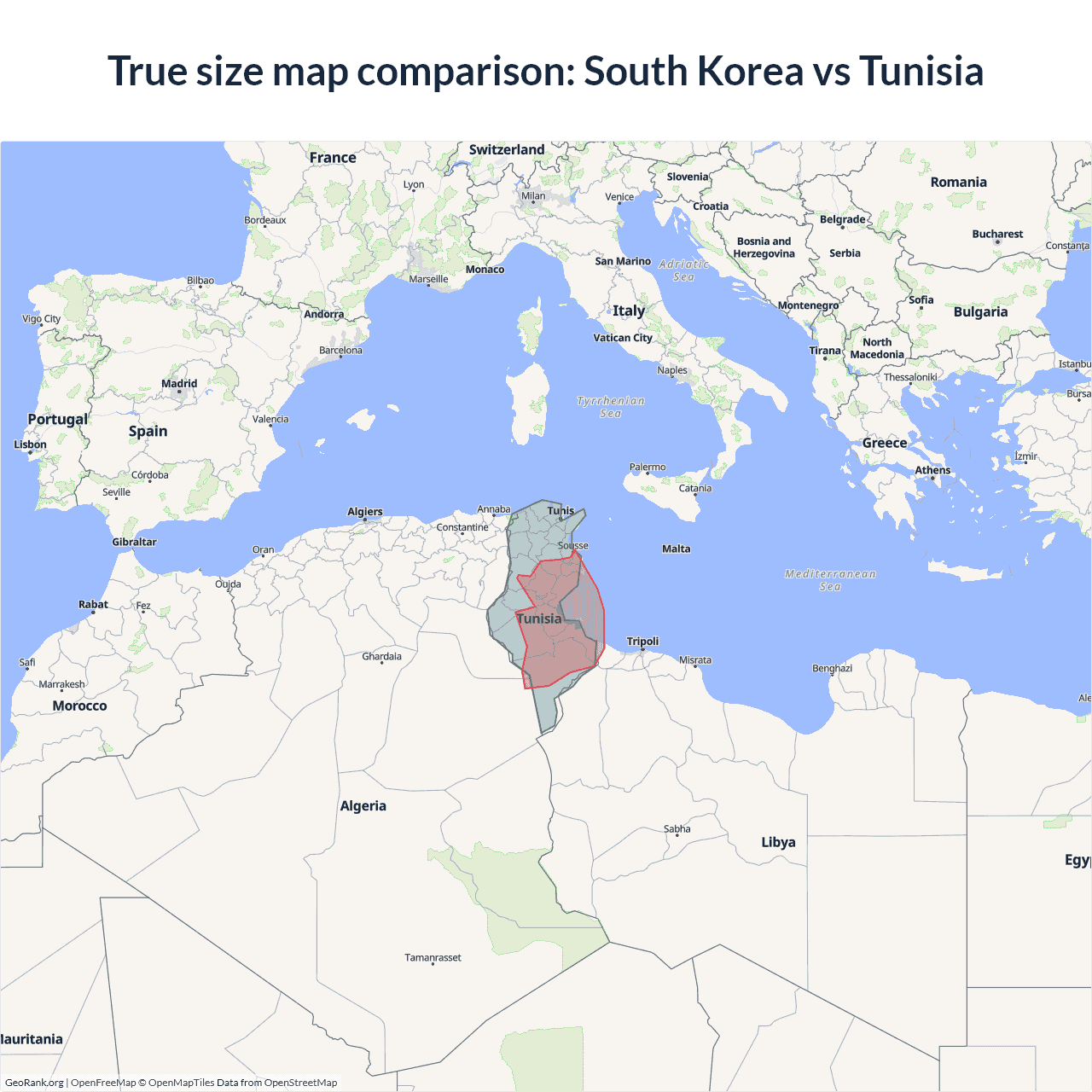 South Korea vs Tunisia size on the map