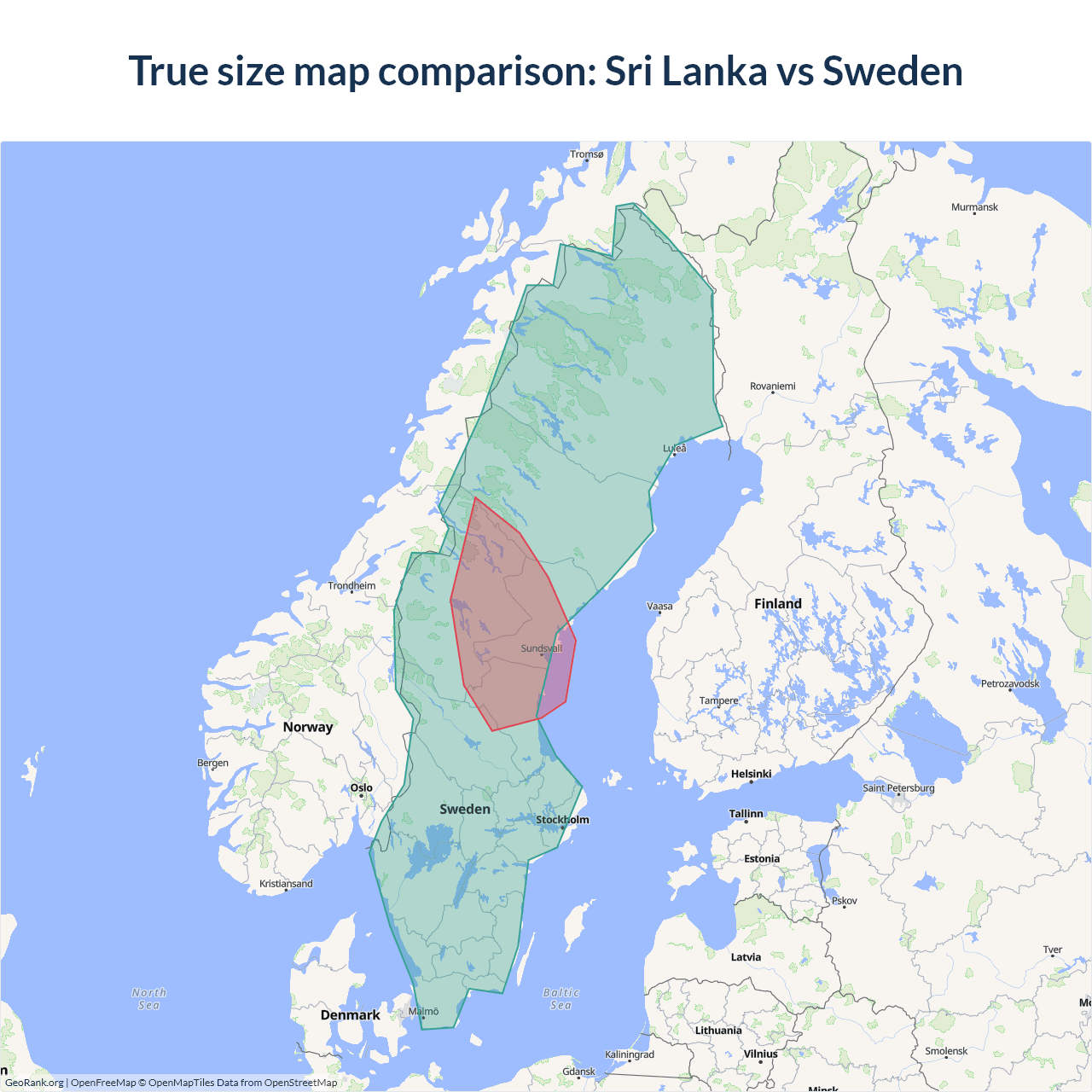 The map above outlines the borders of Sri Lanka and Sweden but is not accurate for size comparison because it's a 2d map with Mercator projection that distorts territories near the poles. The farther a country is from the equator, the more magnified it appears. More about country size projections.