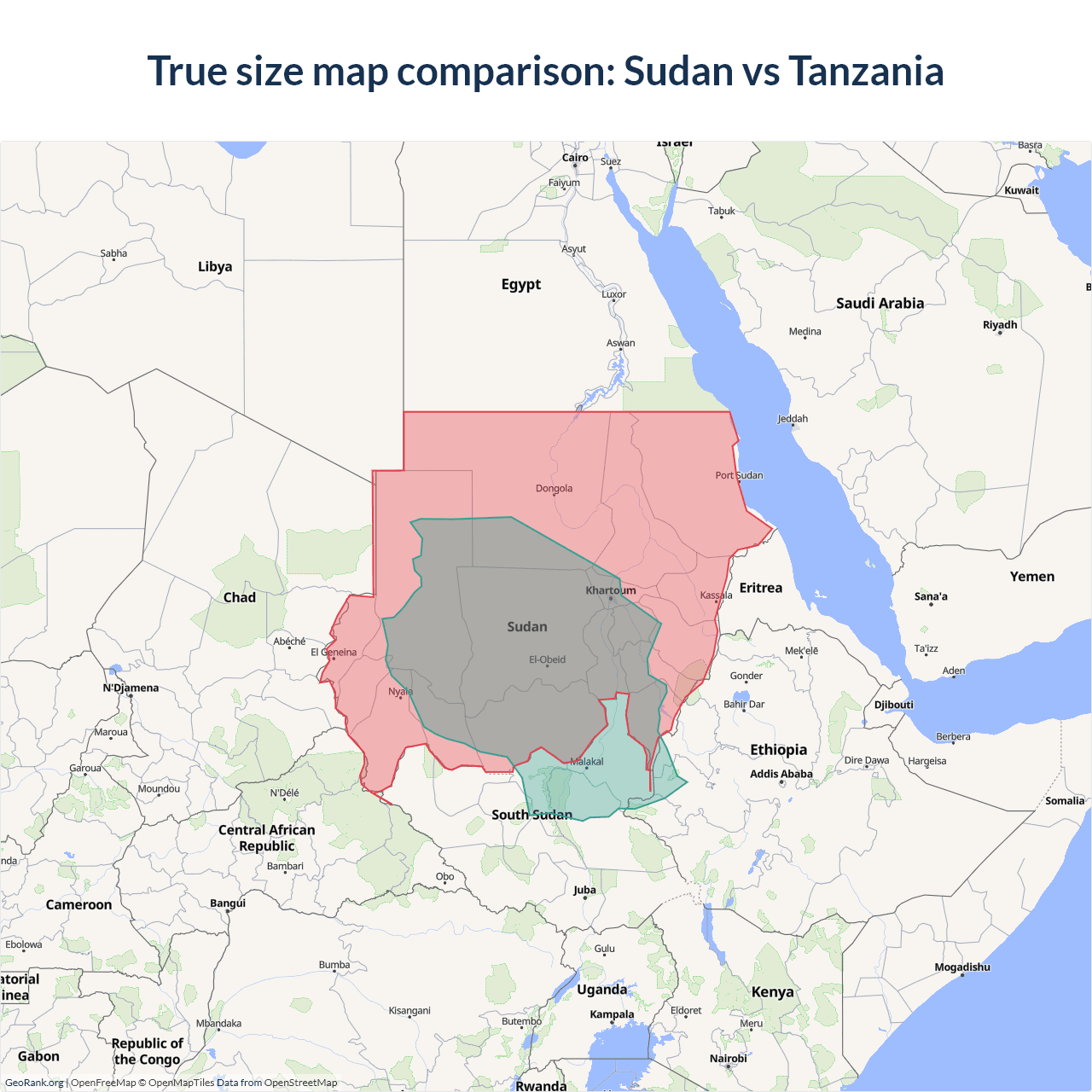 The map above outlines the borders of Sudan and Tanzania but is not accurate for size comparison because it's a 2d map with Mercator projection that distorts territories near the poles. The farther a country is from the equator, the more magnified it appears. More about country size projections.
